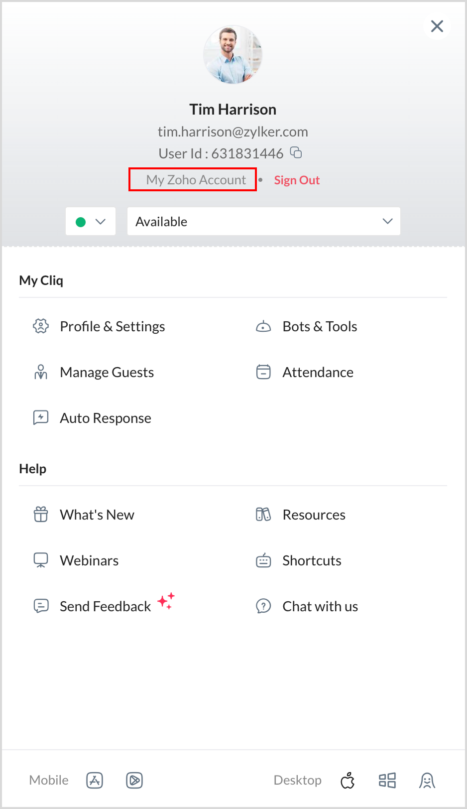 2. 表示されるユーザーパネルで、My Zoho アカウントを選択します。