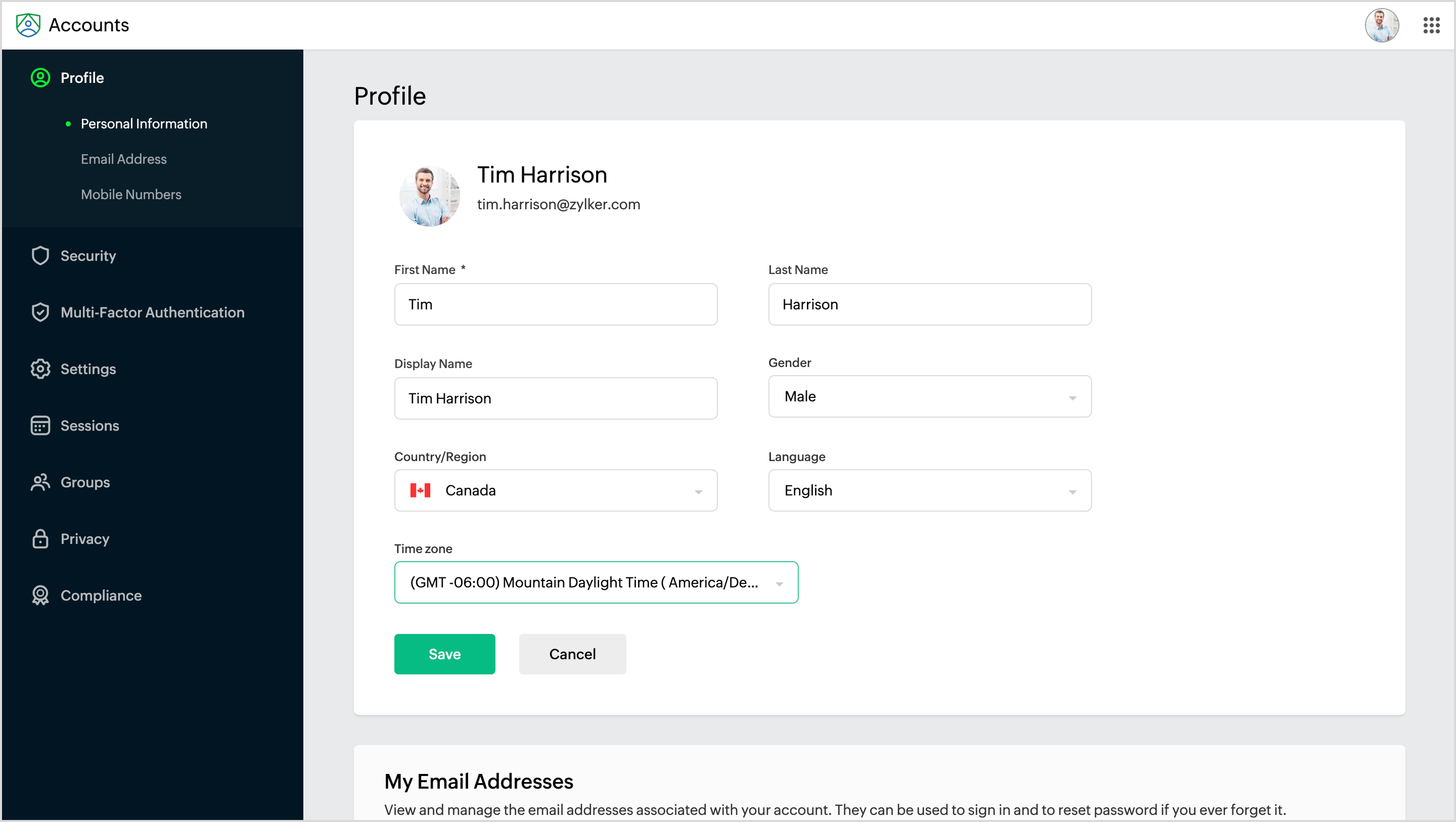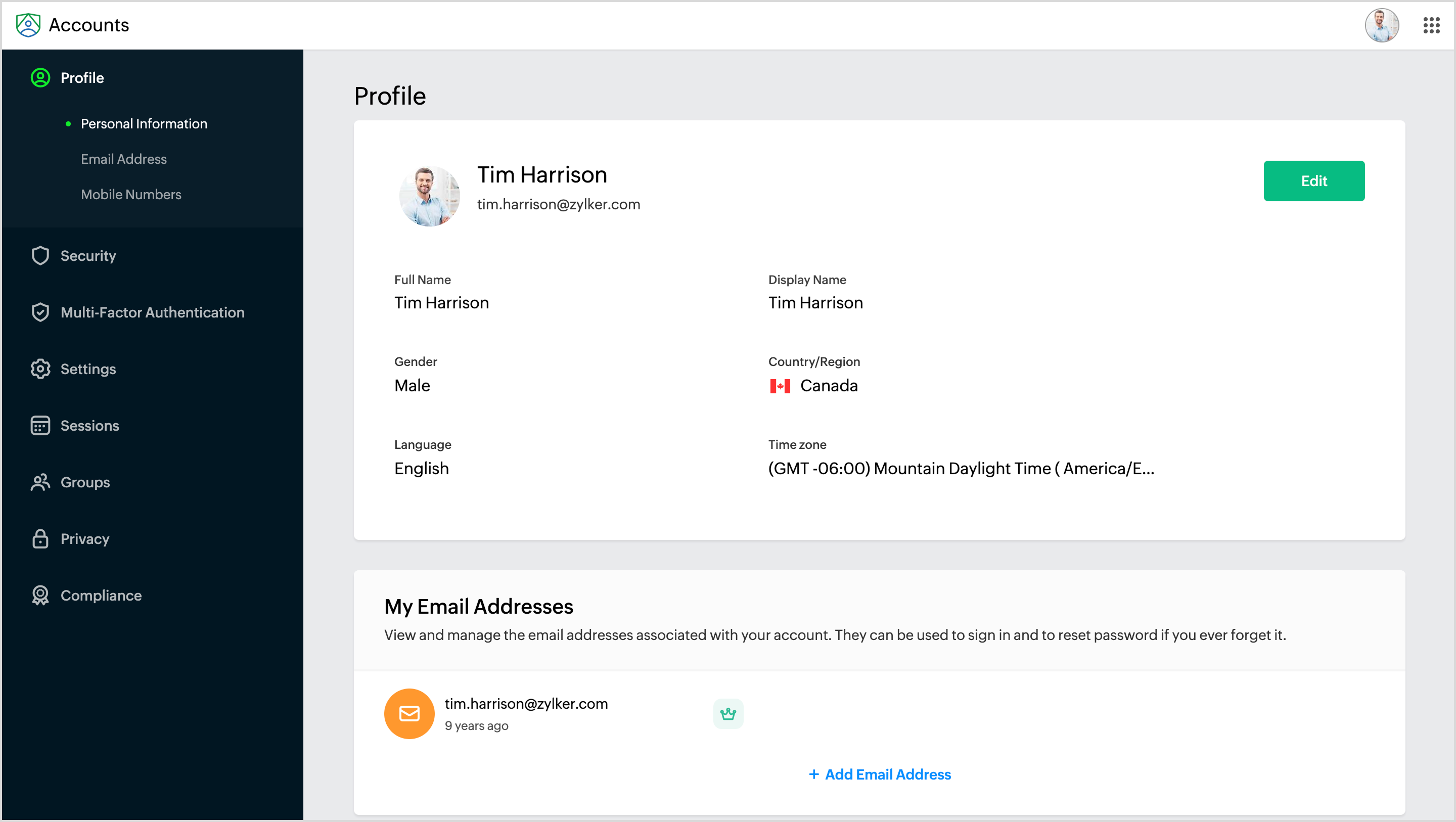 1. どちらの方法でも、Zohoアカウントのページに遷移します。左側のサイドバーでPersonal Informationをクリックし、「編集」を権限の下で選択します。