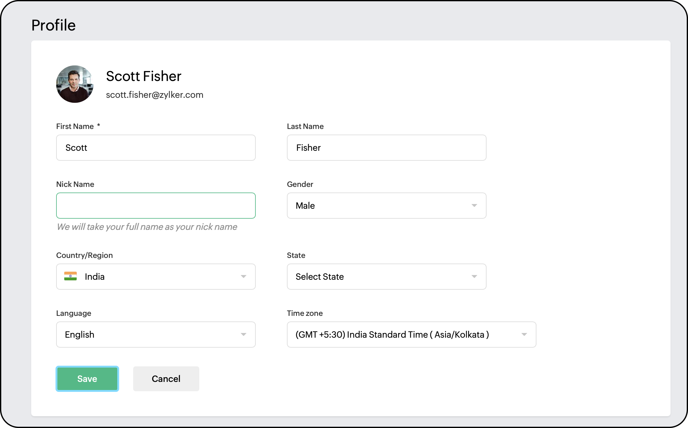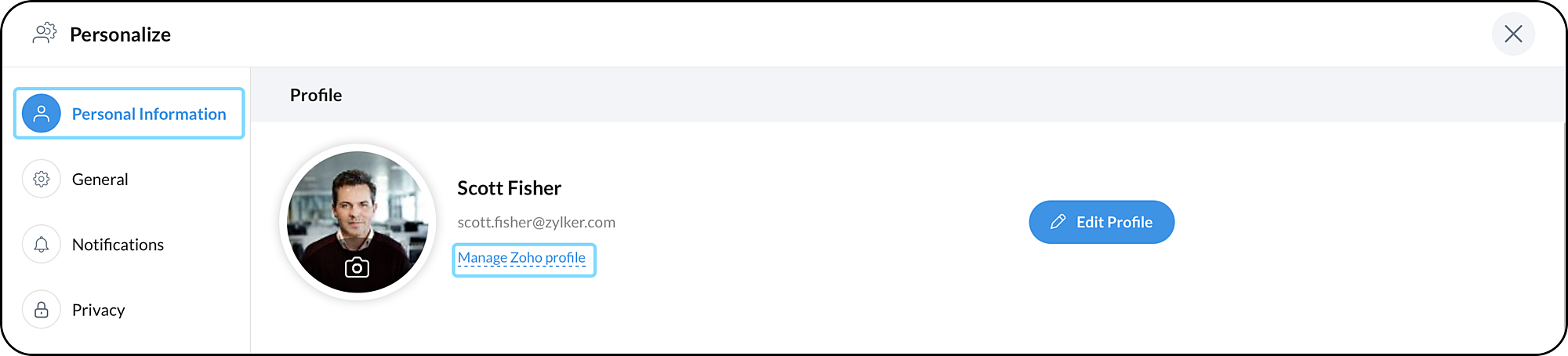 ユーザーパネルに移動して、「プロフィールと設定」をクリックしてください。次に「個人情報」を選択し、「Zohoプロフィールの管理」をクリックしてください。