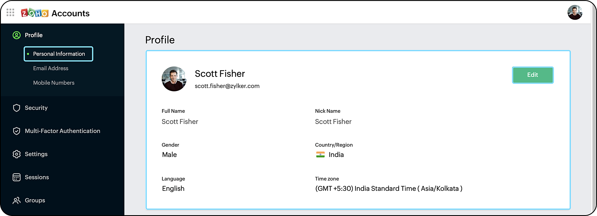 いずれの場合も、Zohoアカウントページに誘導されます。左サイドバーで、「個人情報」をクリックして、「編集」をプロフィールの下で選択します。
