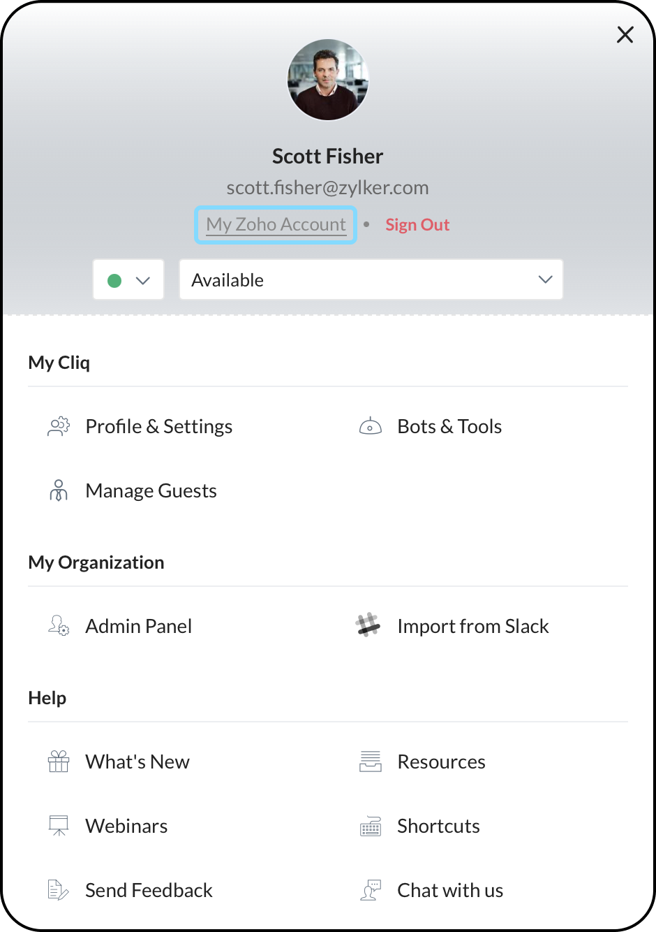 表示されたユーザーパネルから、 私のZohoアカウントを選択してください。