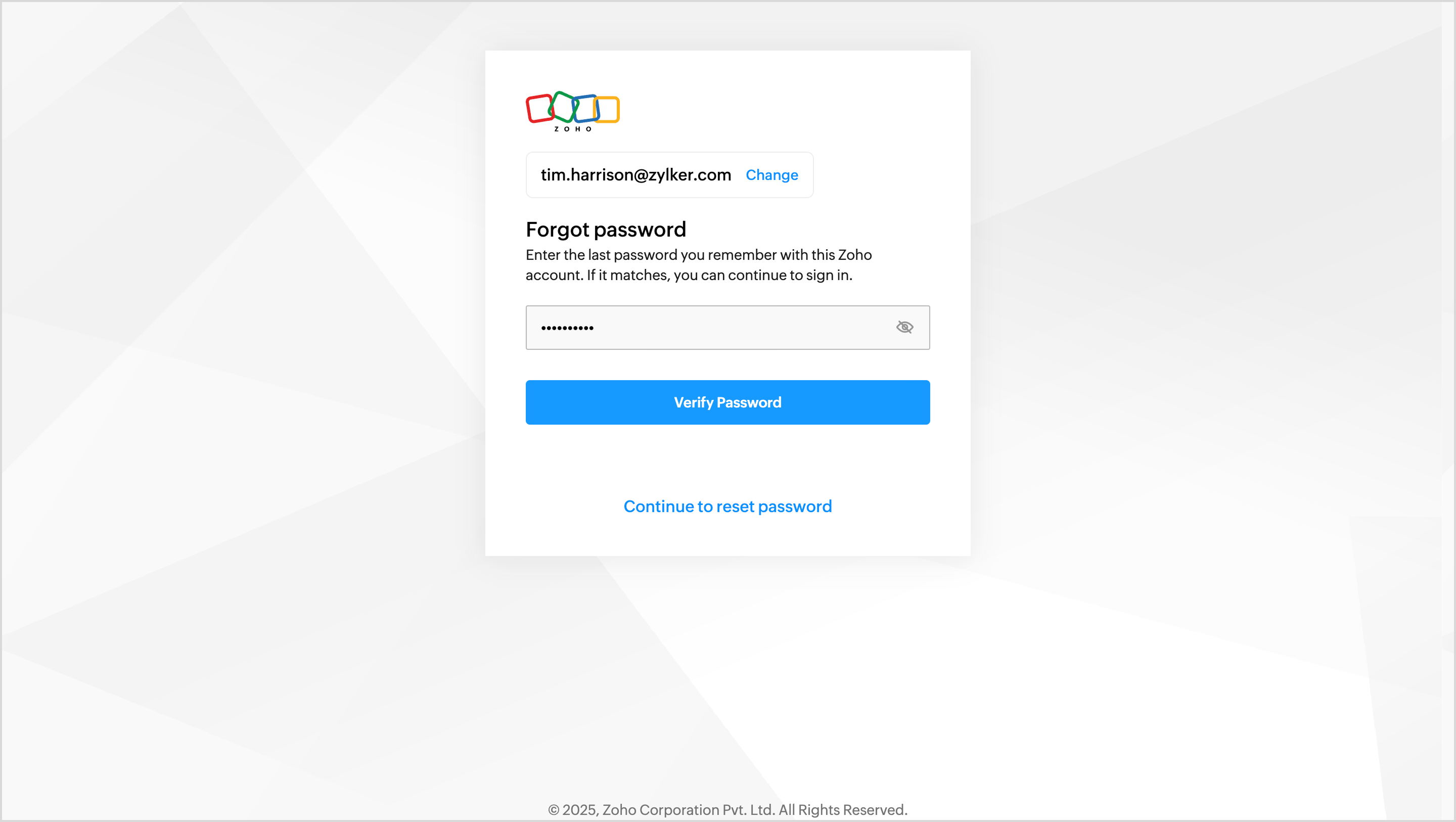 • メールアドレスがZoho メールでホストされている場合、リセット用リンクはメールで受け取れません。この場合、リクエストは管理者に転送されます。