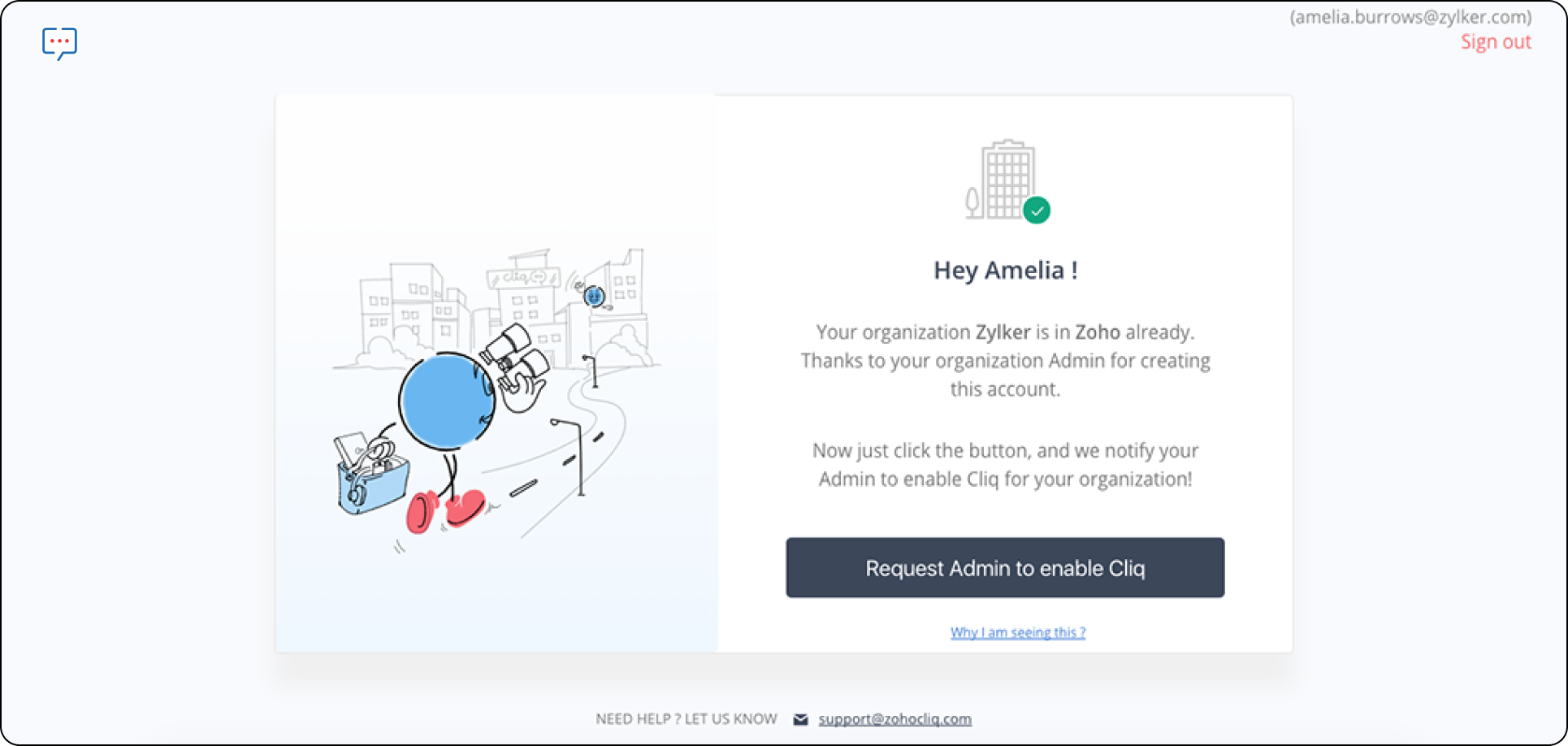 管理者によってのみ組織が作成できます。管理者でない場合は、管理者にCliqに登録するようお願いしてください。もし、既にZoho製品(Mail、Creatorなど)に組織がある場合、管理者がCliqで新しい組織を作成しようとしたときに以下の画面が表示されます。