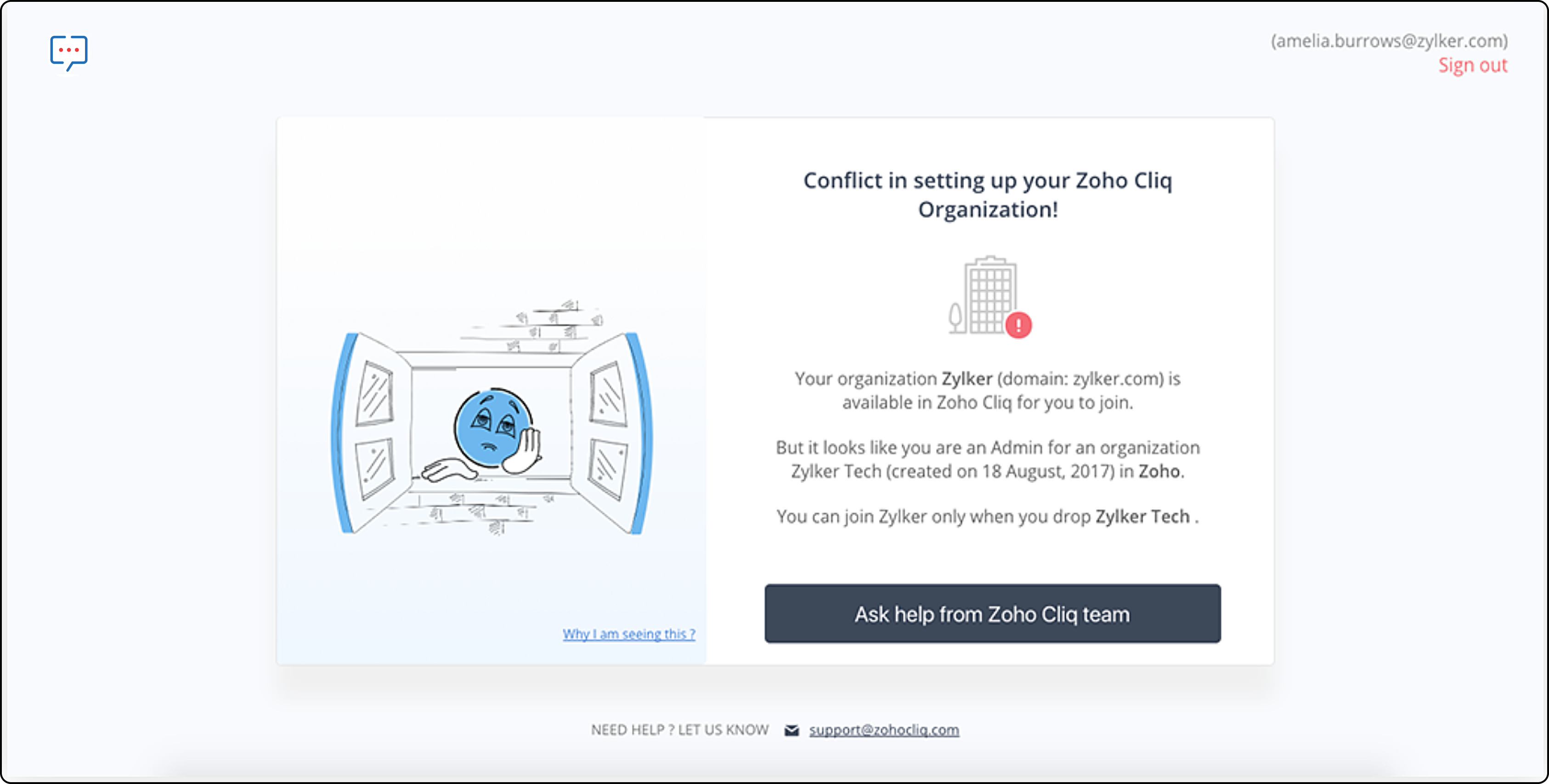 3. 同じドメインの下に既に組織が作成されているため、Amelia Burrowsは新しい組織を作成することができず、Zylker Tech組織を去り、CliqにあるZylker組織に参加するように求められます。