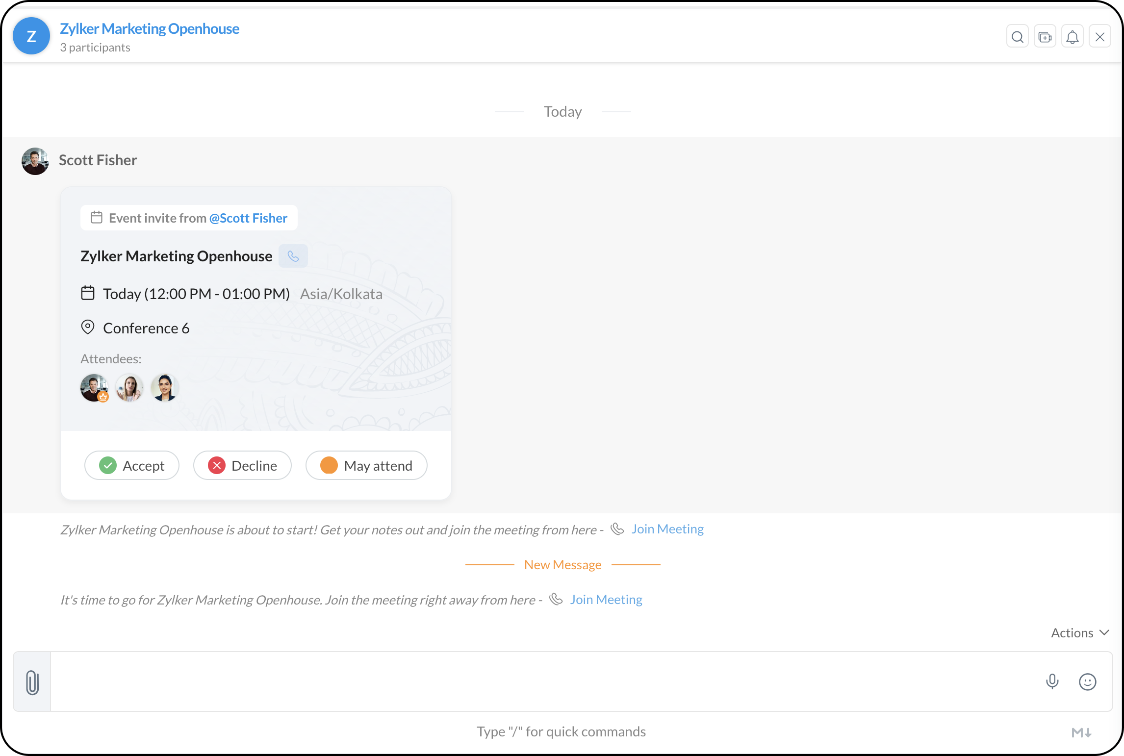 特定の参加者とオンラインミーティングを作成すると、グループチャットが作成され、参加者にグループへの招待状が送信されます。