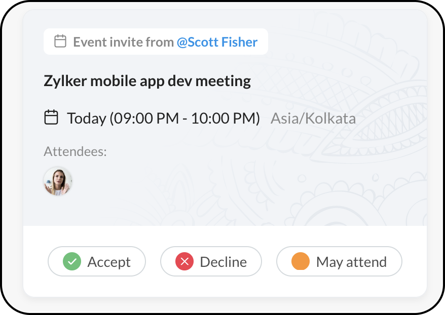 • カレンダーイベントが作成され、参加者に通知が送信されます。参加者は、イベントを受け入れるか拒否するオプションを持つ招待状を受け取ります。