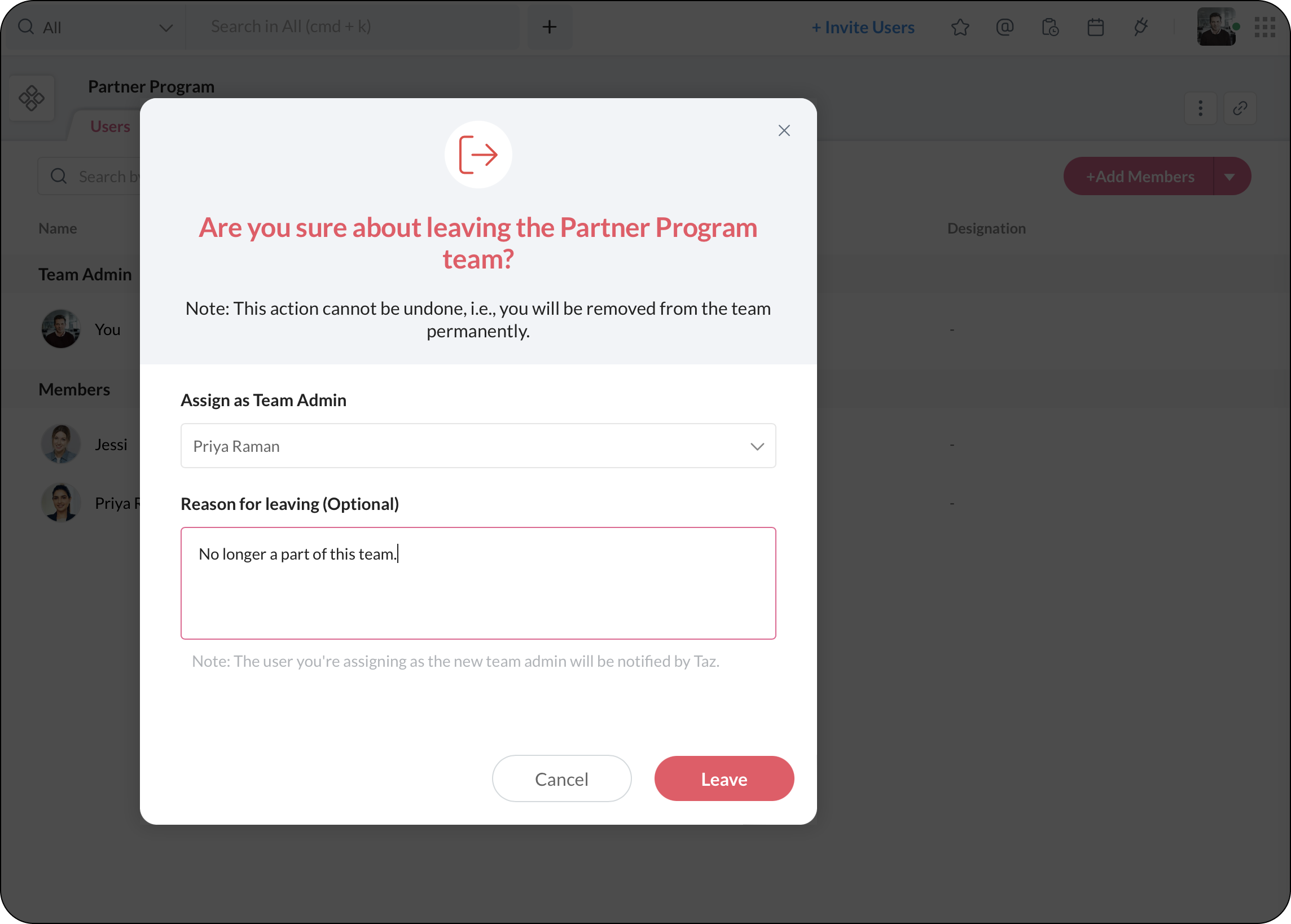 チームを移動すると、あなたが割り当てた新しいチーム管理者にTaz経由で通知が届きます。