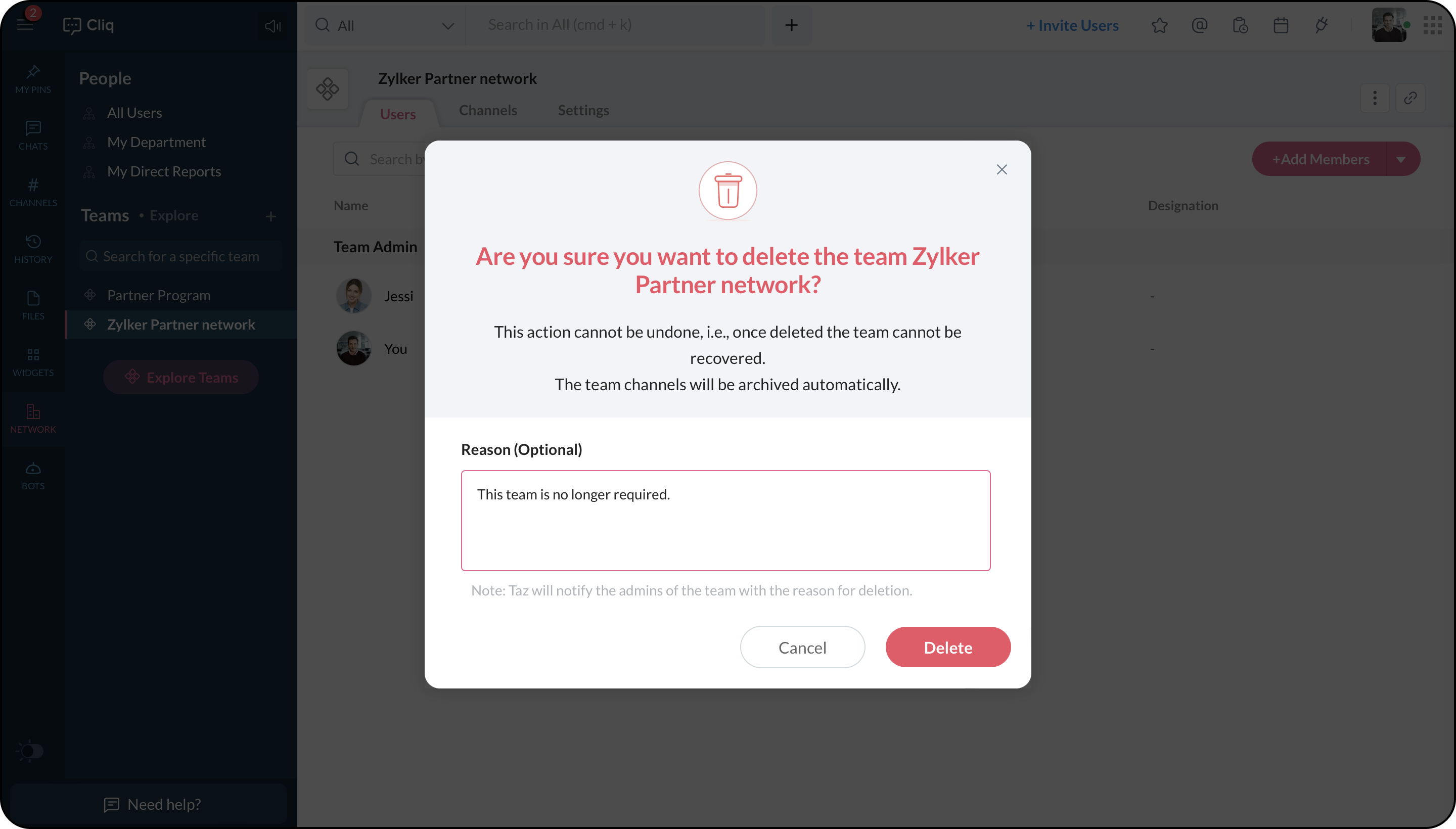 チームを削除すると、すべてのチーム管理者にTazを通じて削除通知が届きます。