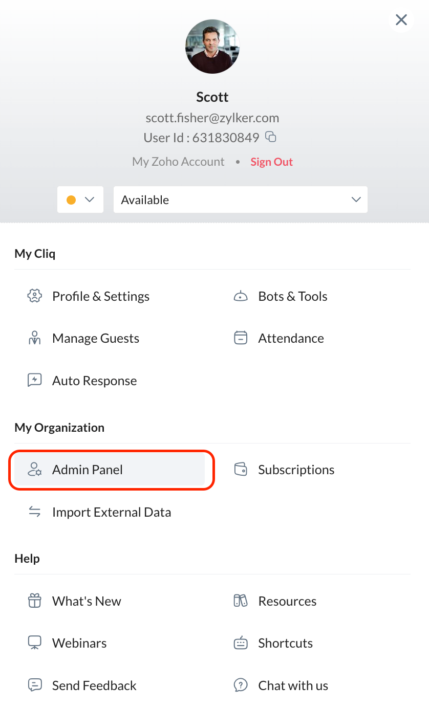 アカウントのプロフィール画像をクリックし、Admin Panelを選択します。