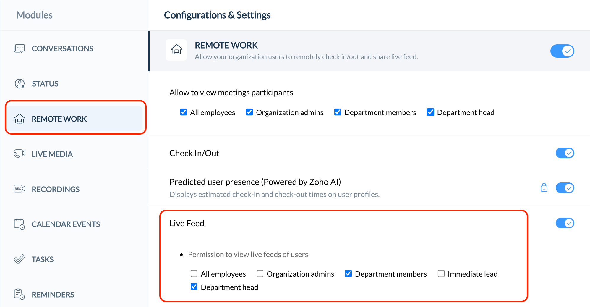 [リモートワーク]セクション内に、ライブフィードの権限が表示されます。