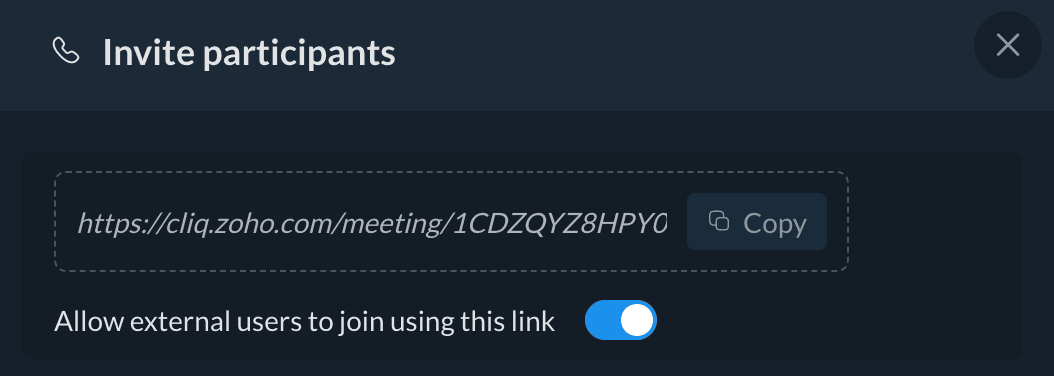 4. [招待]オプションでは、ミーティングリンクをコピーして参加者を招待できます。また、トグルをオンにして、外部ユーザーがリンクから参加できるようにすることもできます。