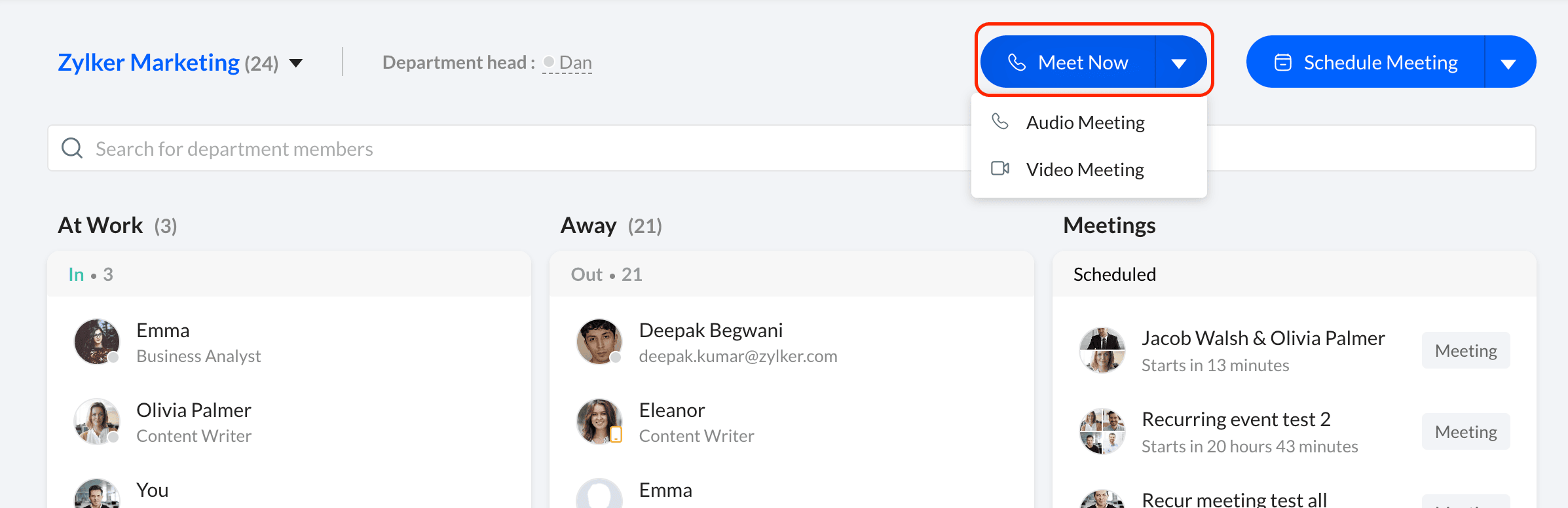 Cliq のリモートワークでは、Meet Nowオプションを使って、すぐにミーティングを開始できます。音声ミーティングかビデオミーティングかを選択できます。