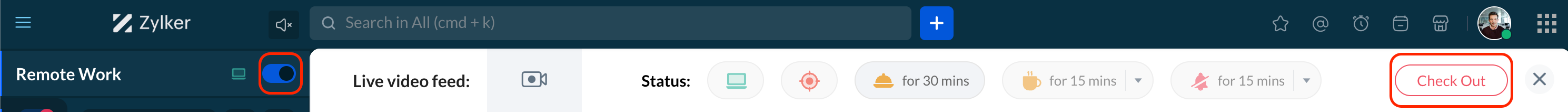 リモートワーク中は、Zoho Cliq の「Remote Work」画面でトグルボタンをスライドするだけで、出勤・退勤を行うことができます。出勤すると、勤務時間の計測が開始され、再度トグルをクリックすると退勤できます。