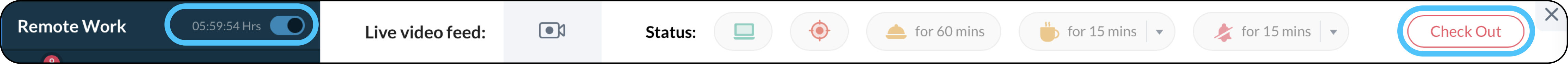 リモートワークへのチェックイン方法は2つあります。Cliqのホームページの左上にあるリモートワークトグルをクリックするか、リモートワークをクリックしてリモートビューへ移動し、ステータスバーにあるチェックインアイコンをタップしてチェックインします。同様に、ステータスバーにあるチェックアウトアイコンをタップしてチェックアウトします。