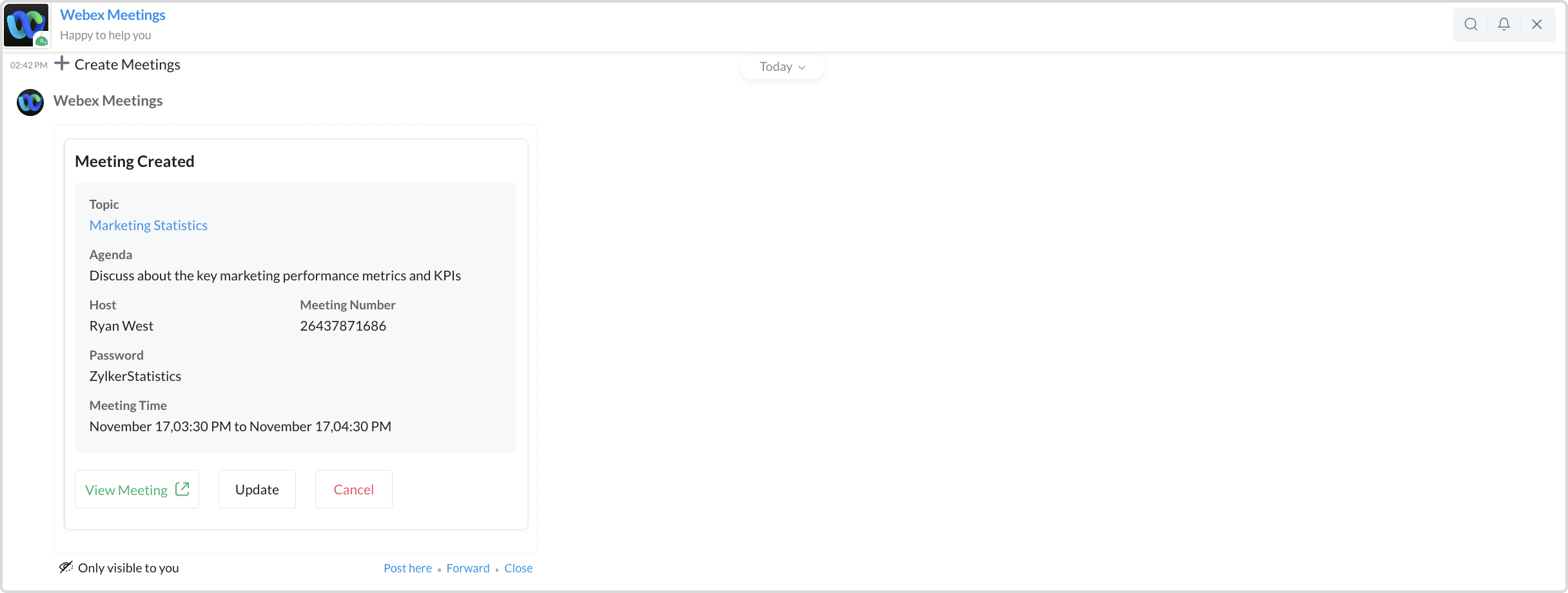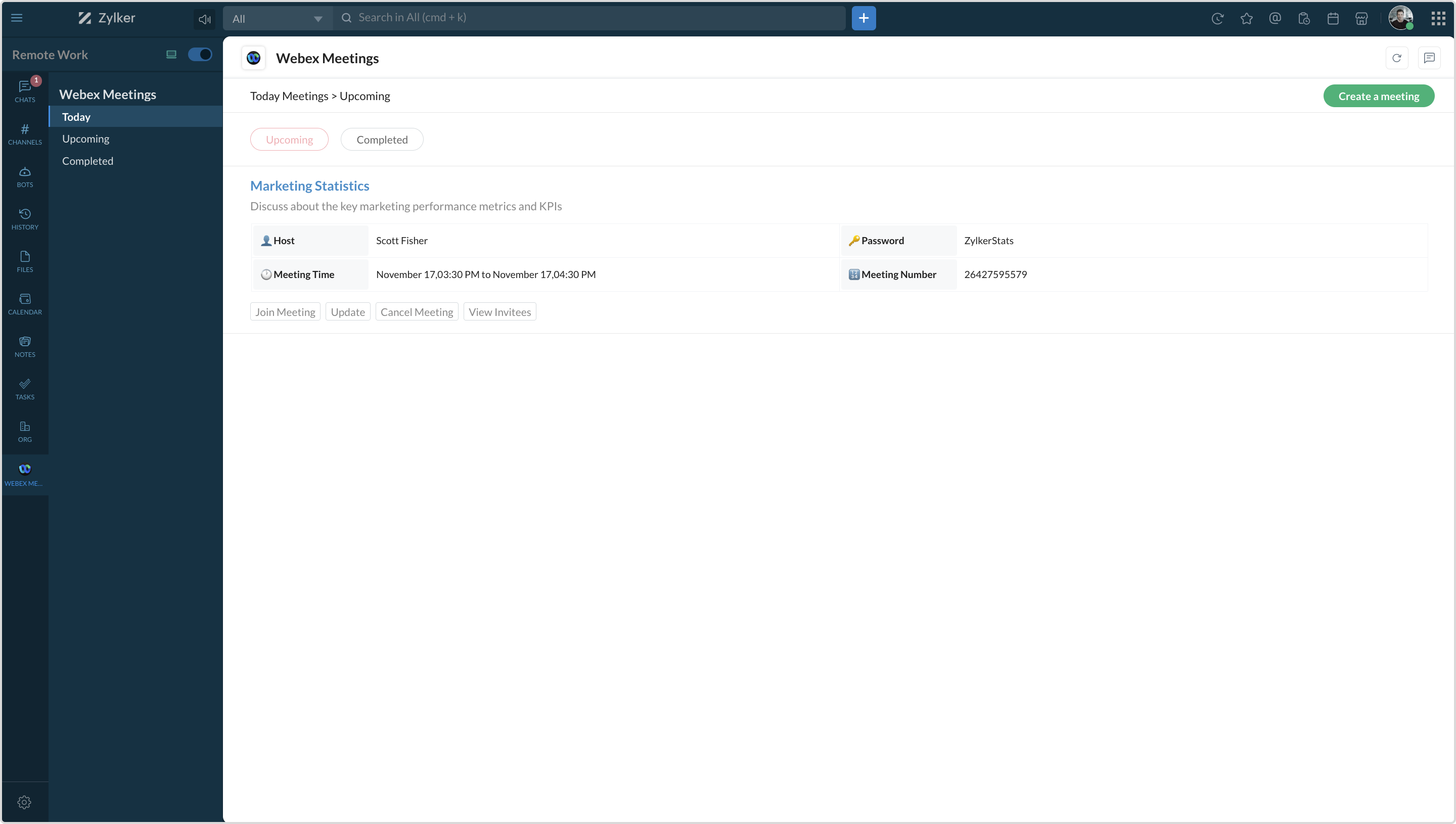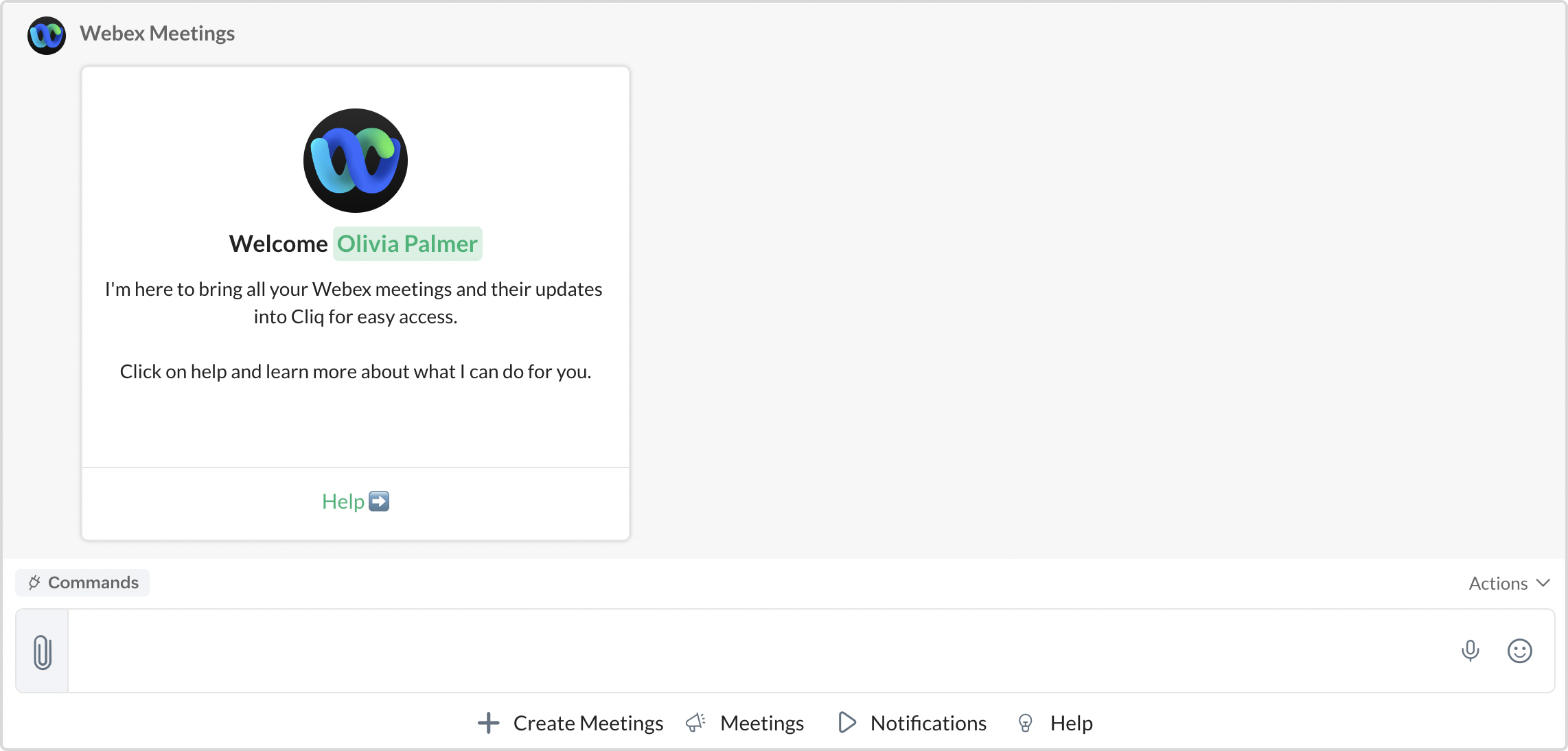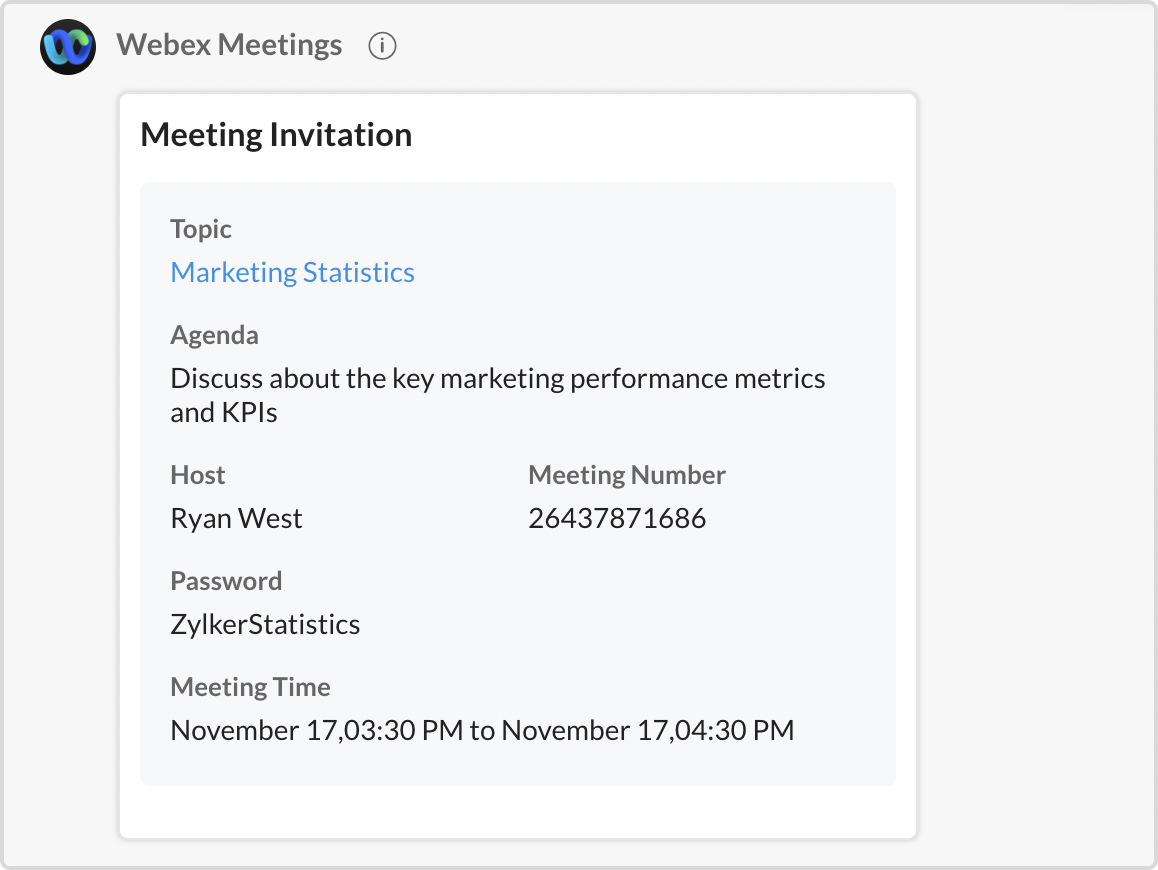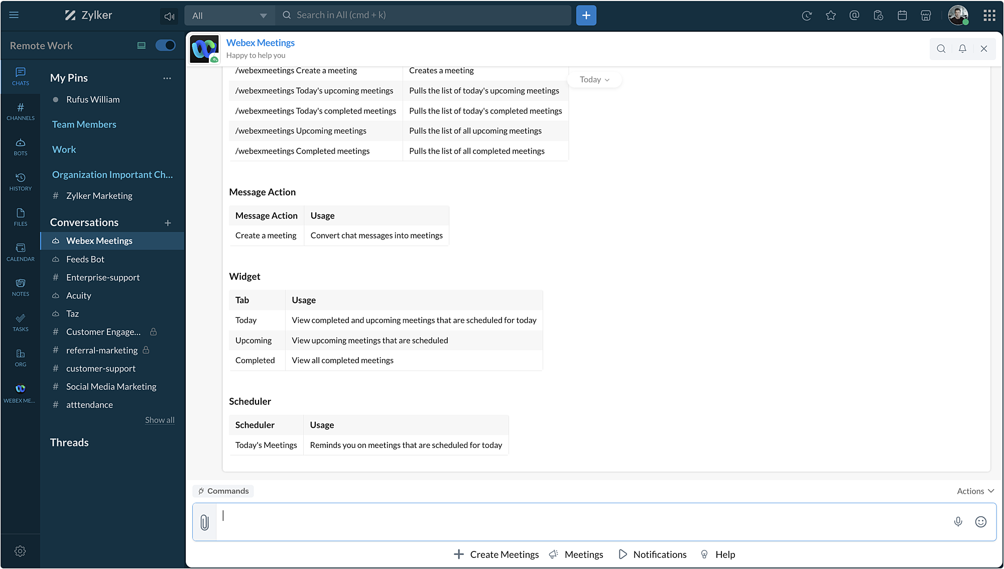 Webex 予定をZoho Cliqと連携させることで、Cliq内で予定の作成や参加が可能です。また、予定に関するさまざまな処理も行えます。