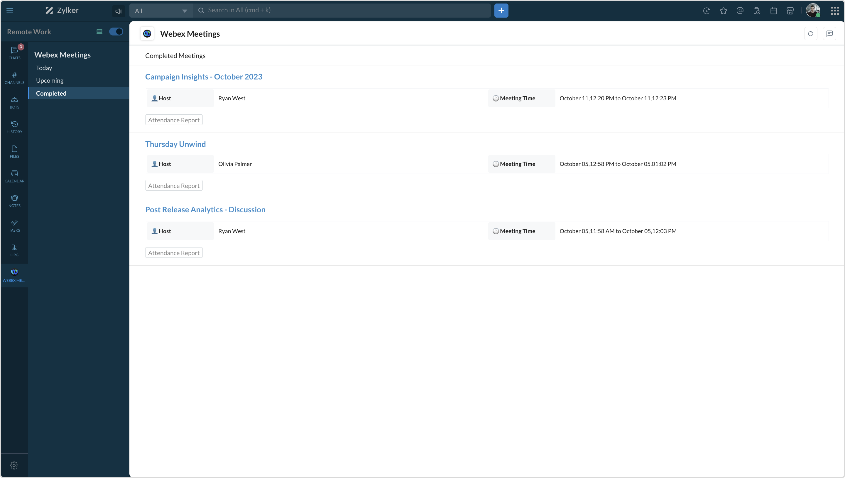 参加した予定をここで表示できます。表示される予定には、トピック、アジェンダ、ホスト、予定時間などの詳細が含まれています。また、Attendance レポート ボタンで予定の参加者リストを表示することができます。