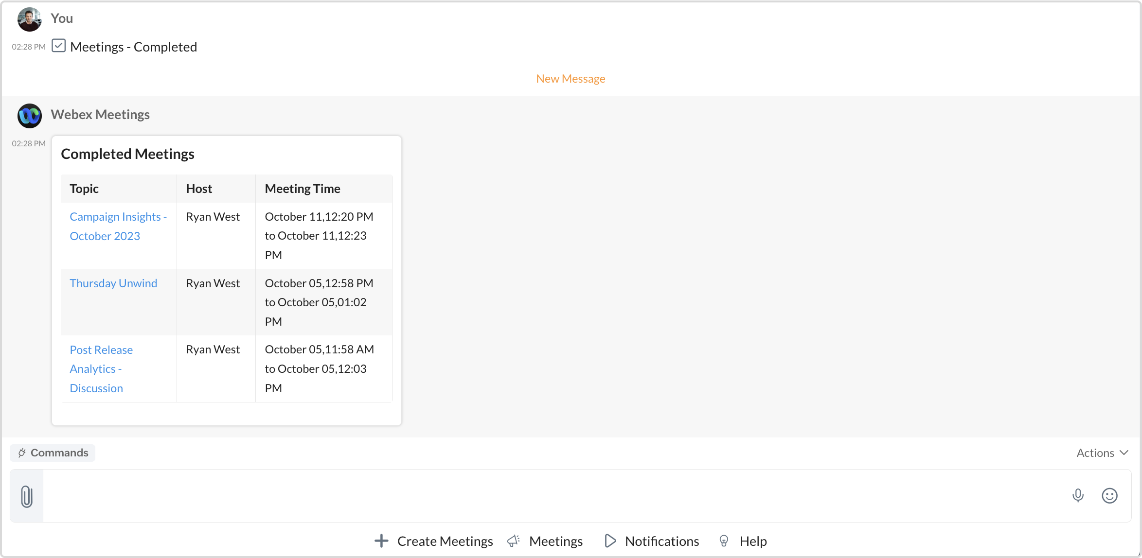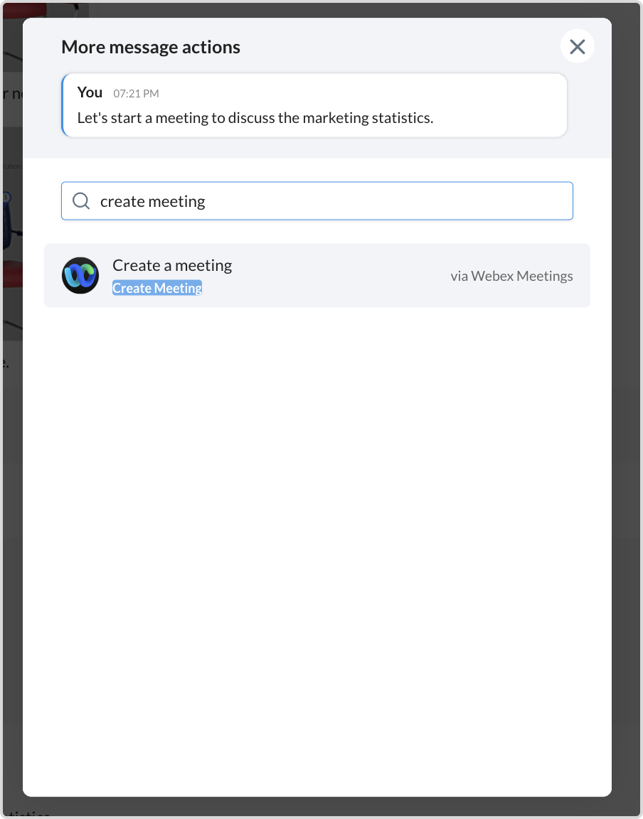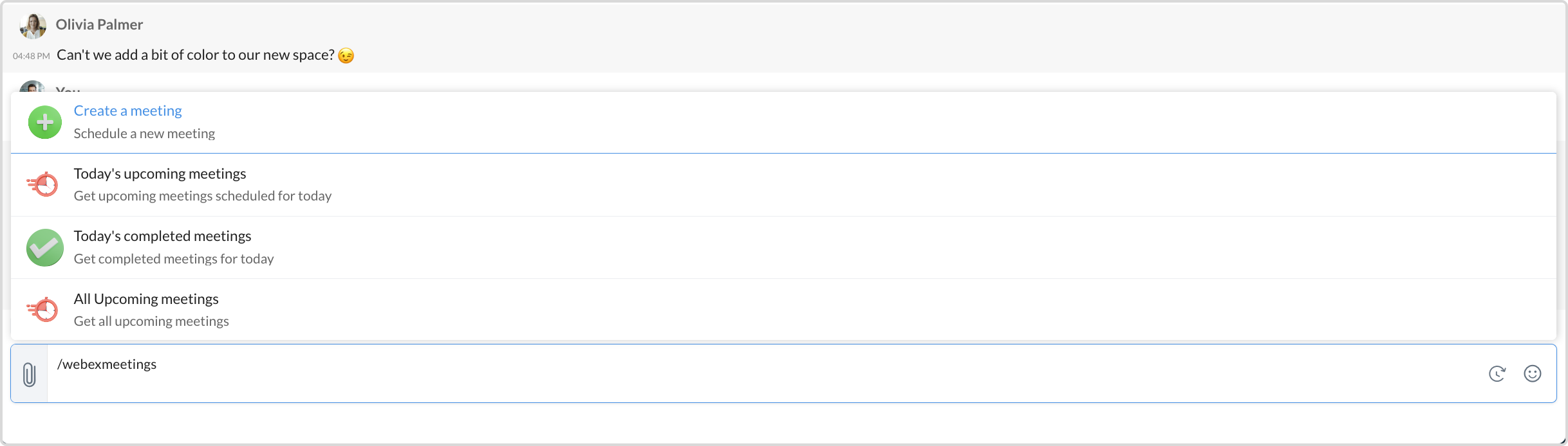 メッセージ作成画面で /webexmeetings スラッシュコマンドを使用し、次の4つの提案を利用できます。