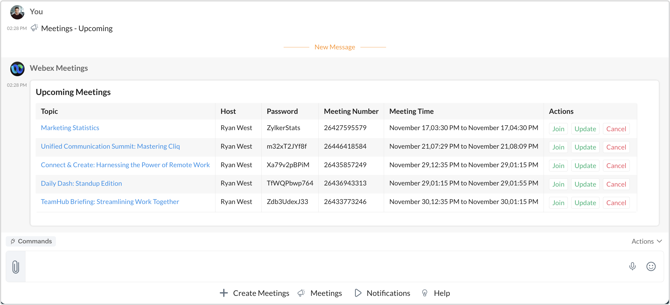 Zoho Cliq では、メッセージ処理を利用して受注データを[パッケージ]データに変換したり、WebEx 予定のトピックにメッセージを追加したり、予定を作成したりできます。