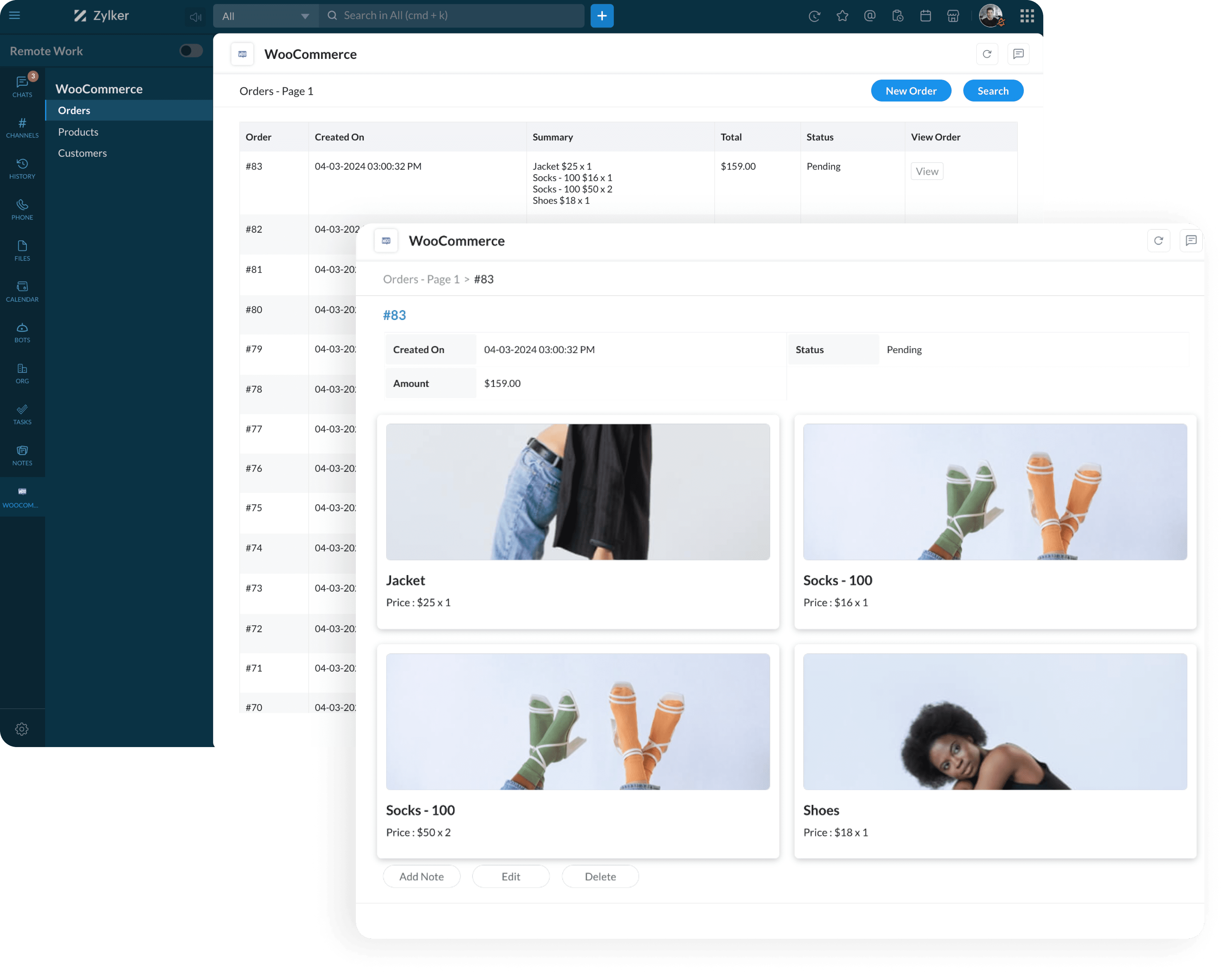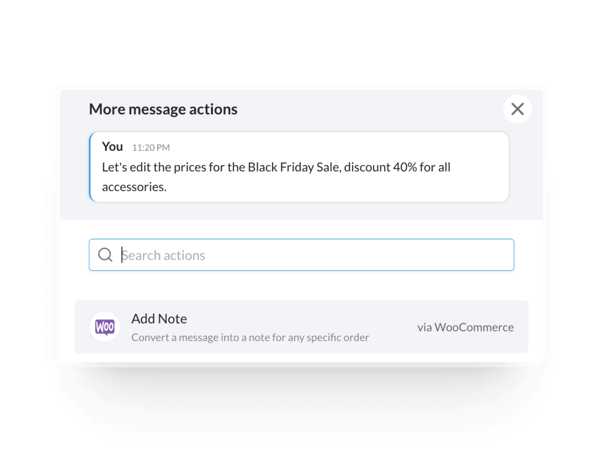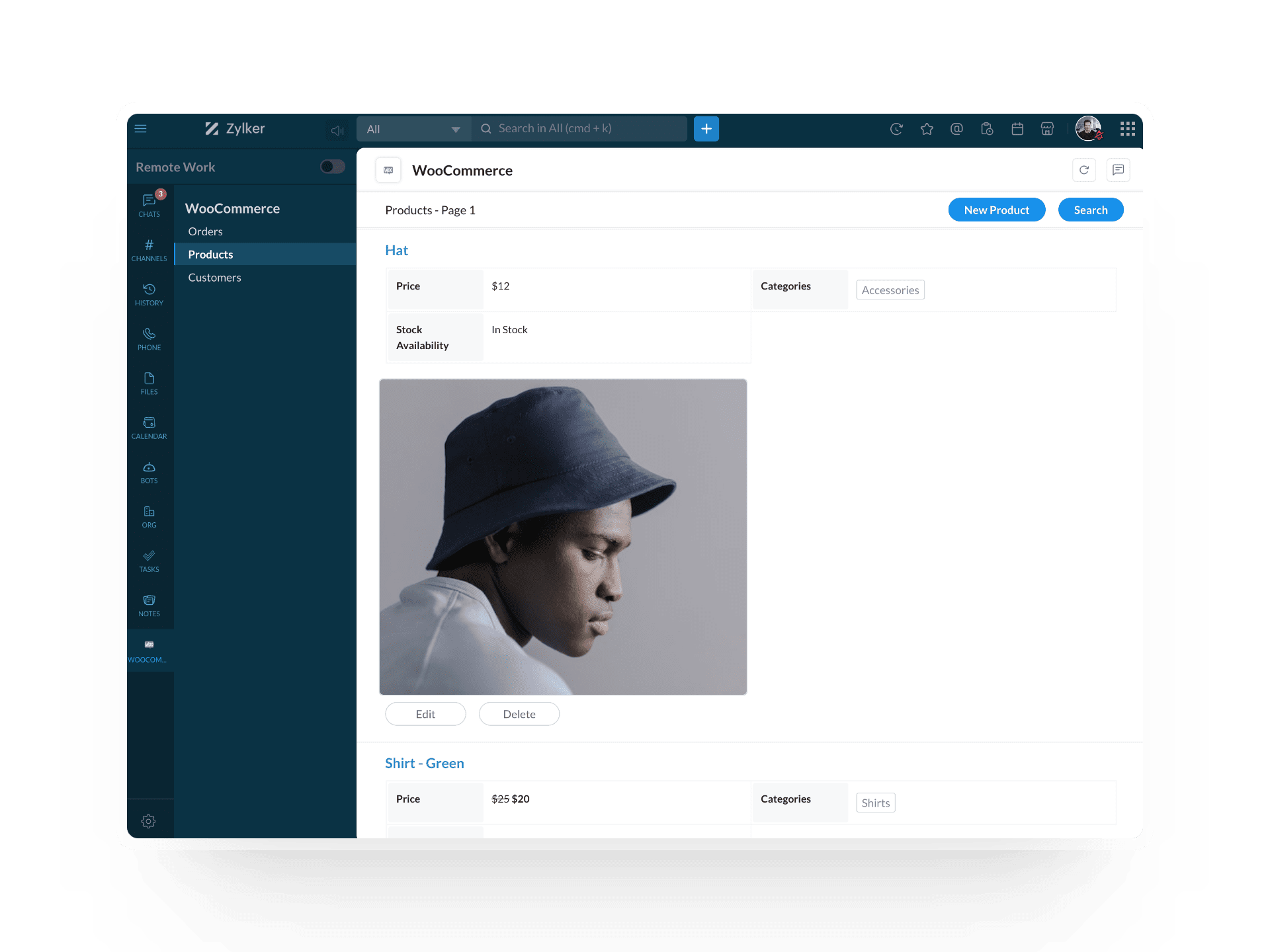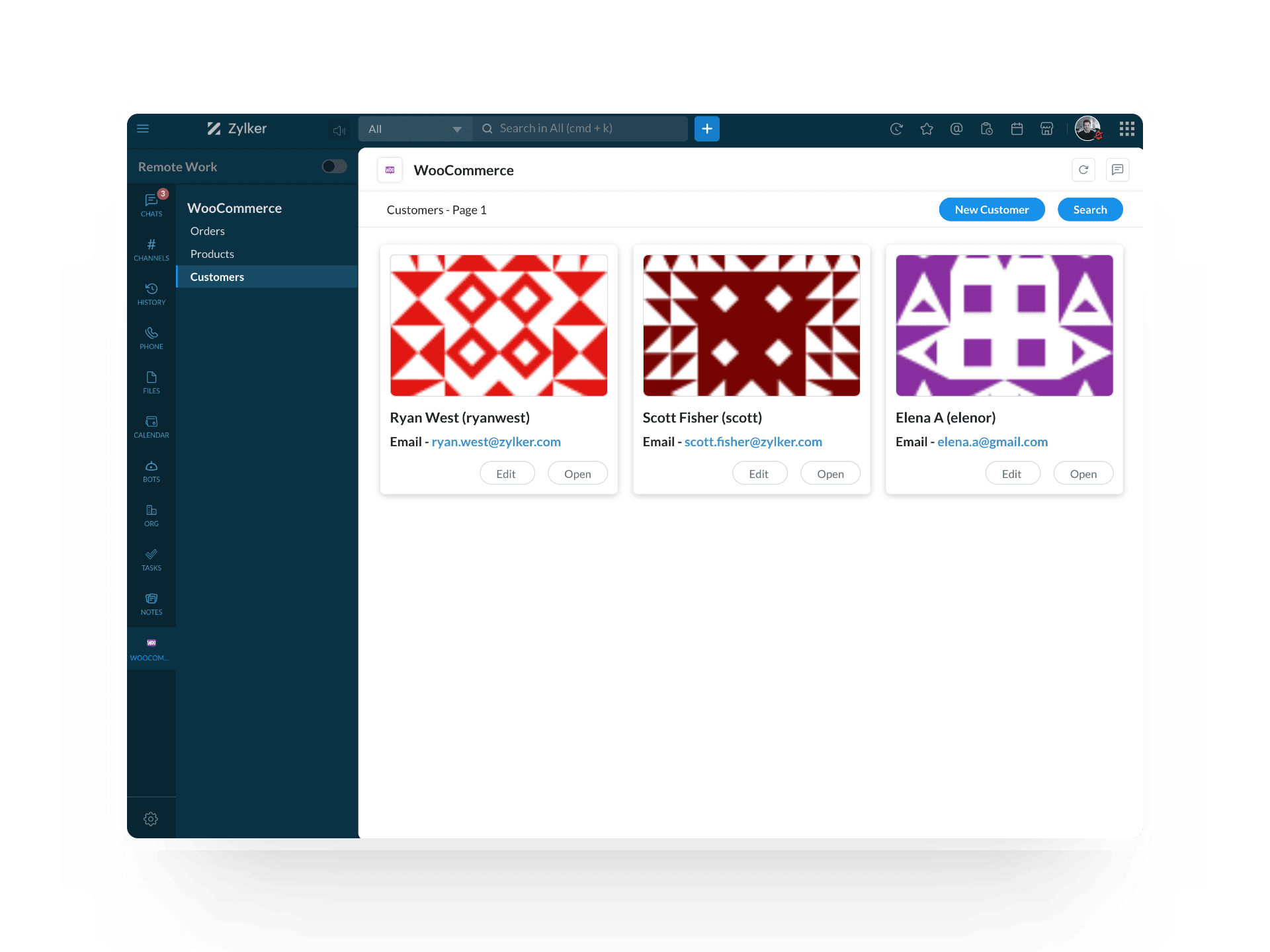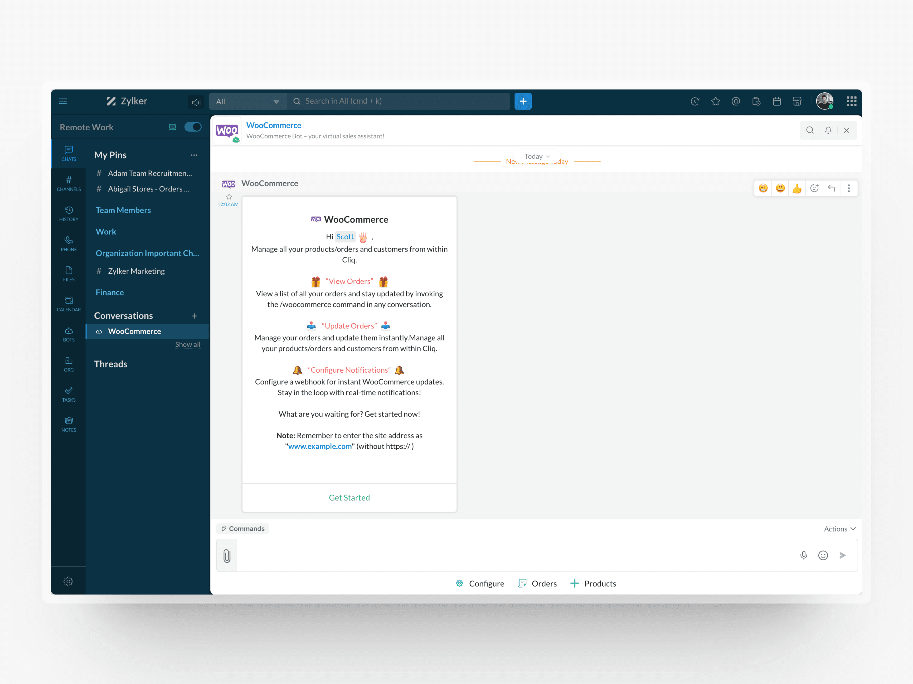 Zoho Cliq x WooCommerce拡張機能を使えば、オンラインストアの管理が簡単です。強力な拡張機能により、eコマースの運用をひとつの場所でまとめて管理でき、注文・商品・顧客サービスに関する重要事項を見逃すことがありません。
