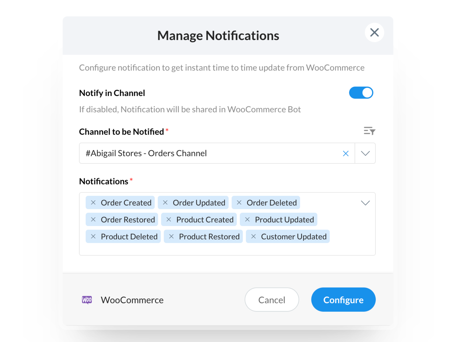 通知の受信方法も選択できます。WooCommerceボットから直接、またはご希望の特定チャネルにて受け取ることが可能です。