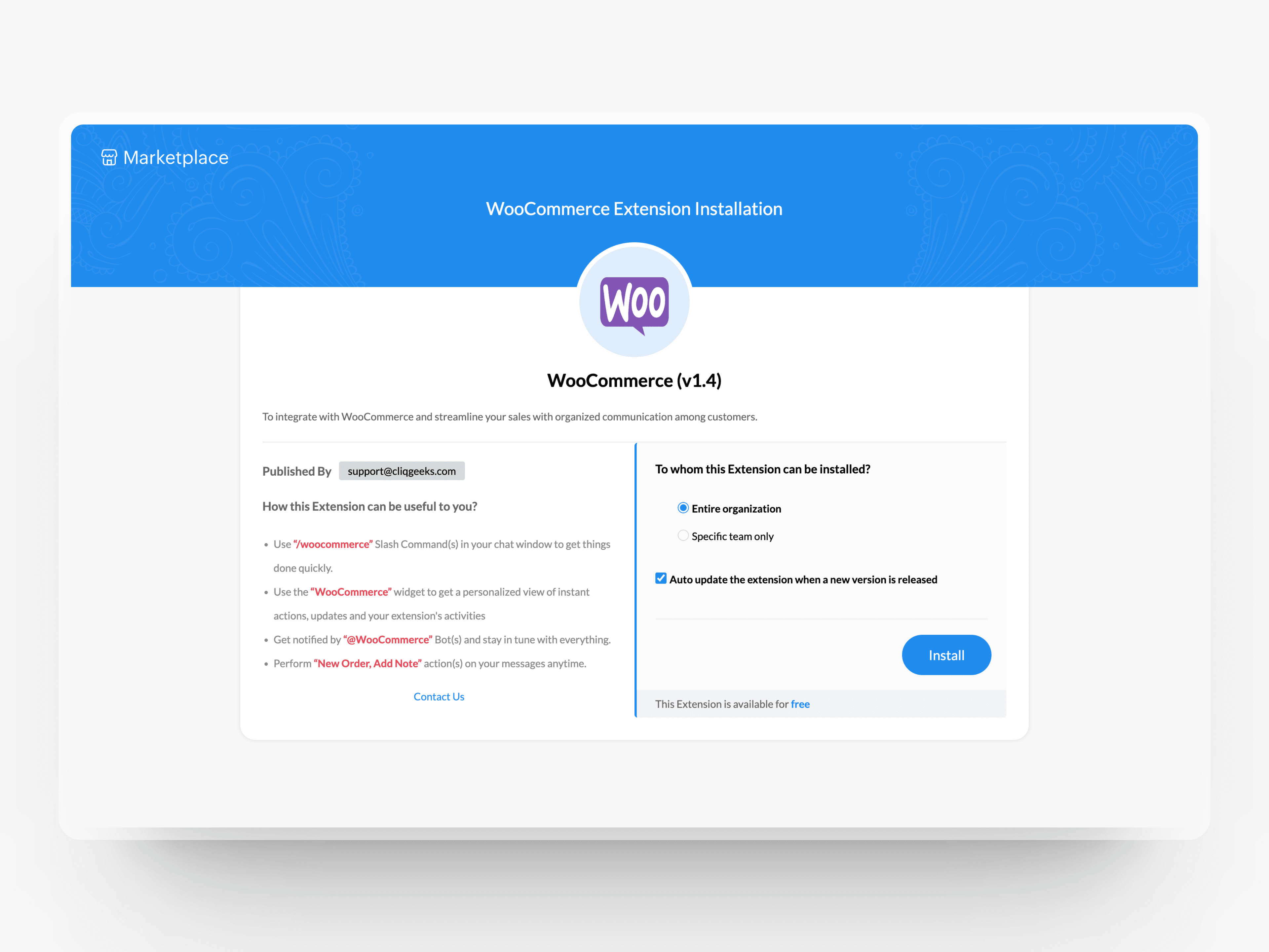 Zoho Cliq マーケットプレイスへ移動し、「WooCommerce for Zoho Cliq」で検索、または こちらからインストール →。