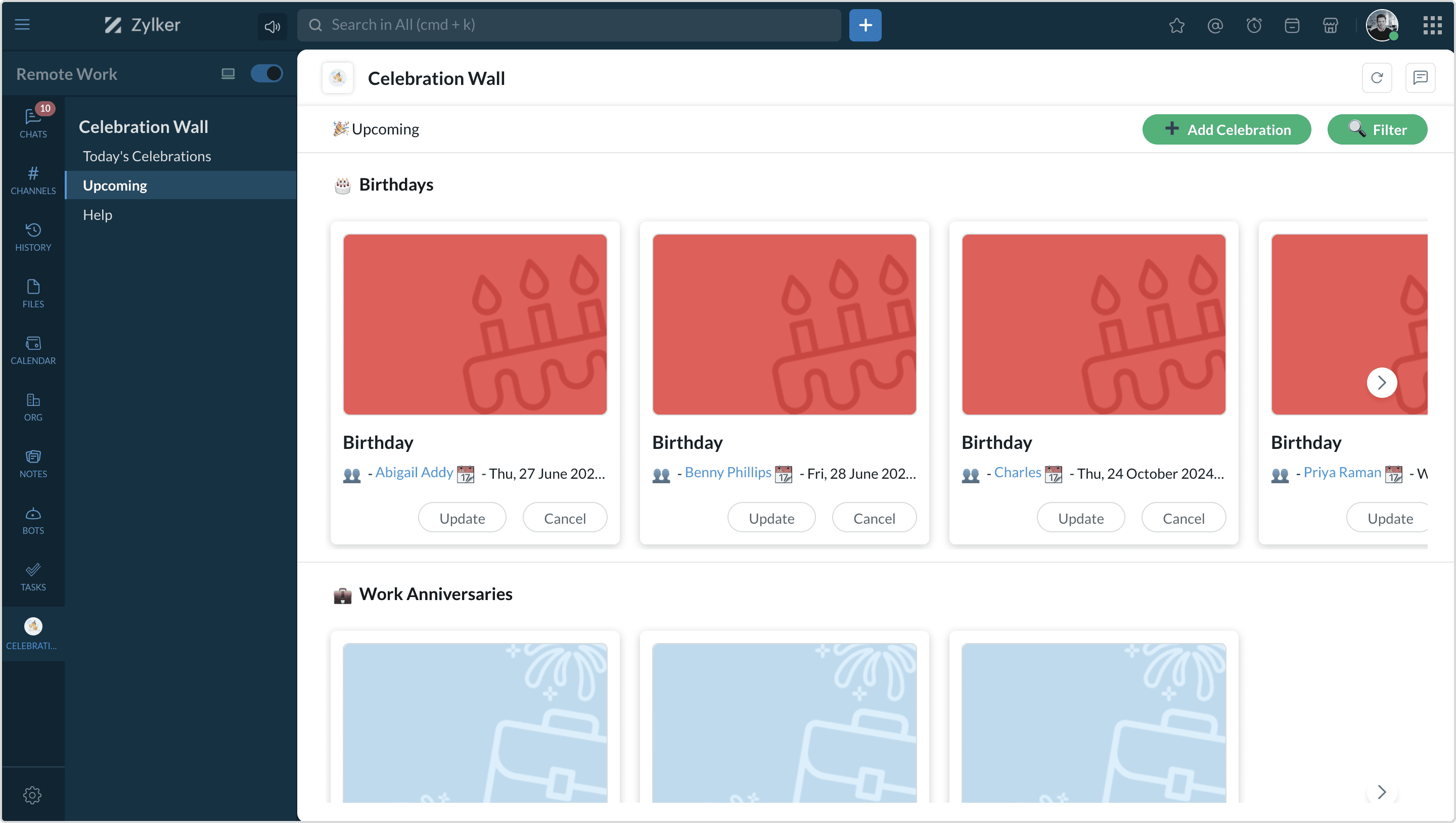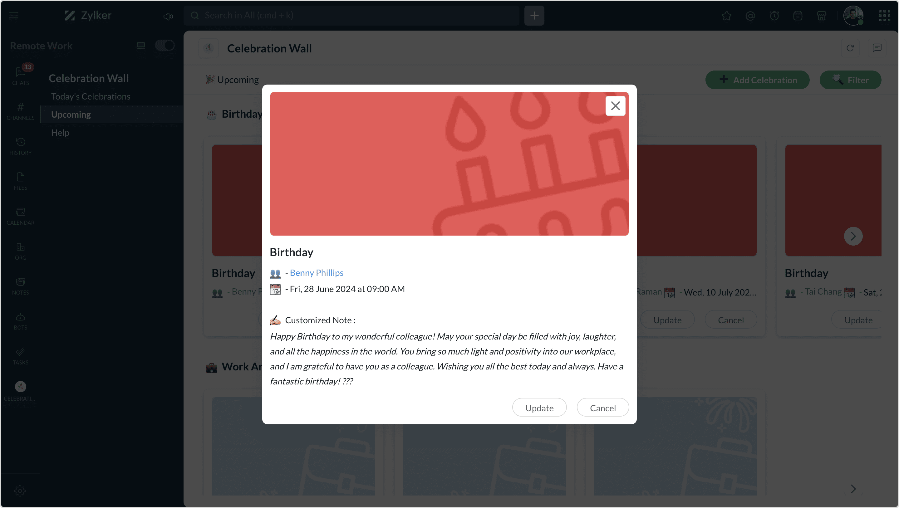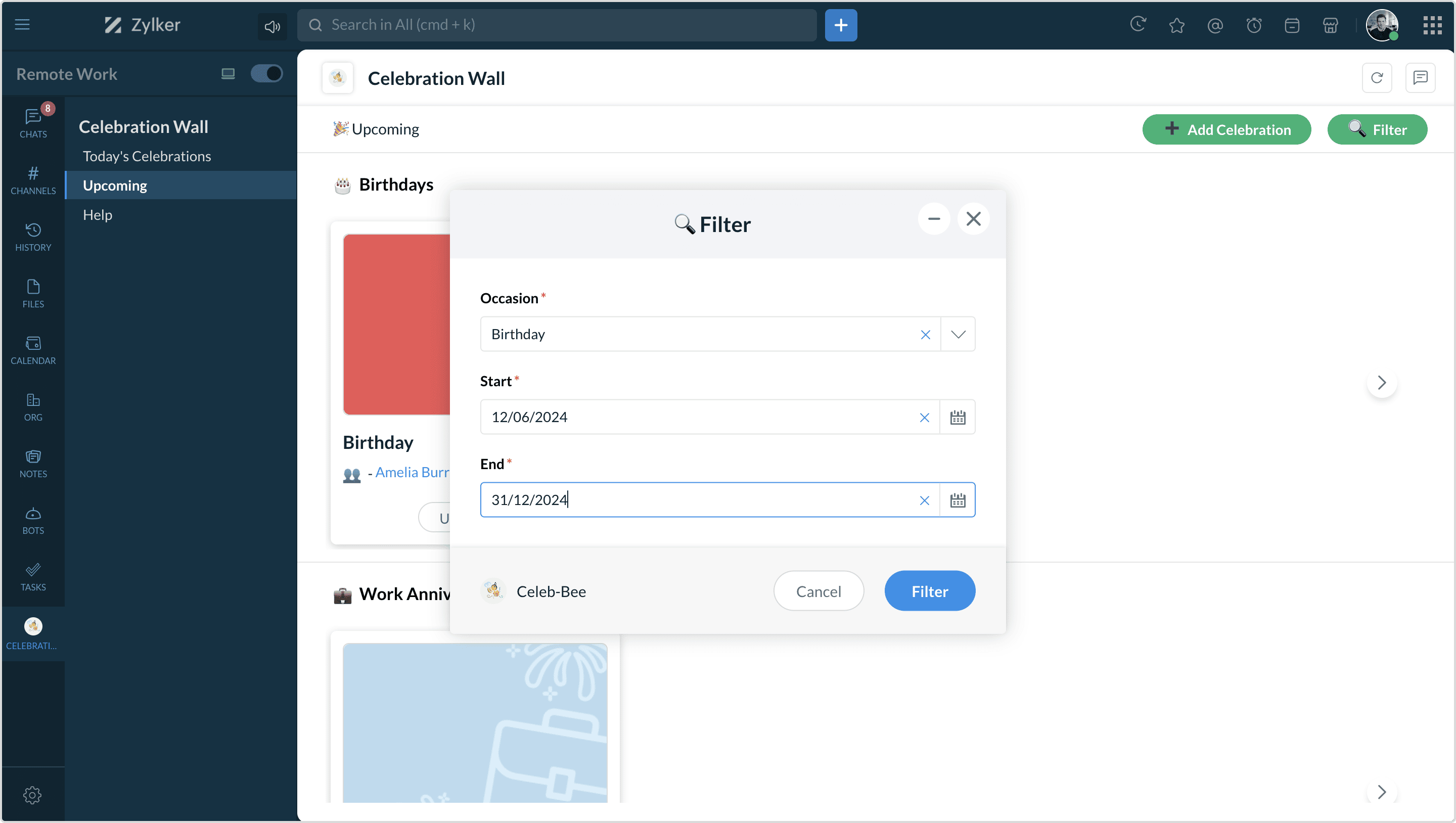 Buzz! Zoho CliqのCeleb-beeを使えば、同僚の特別な瞬間を見逃すことはありません。誕生日や勤続記念日、婚約、または他のパーティーの理由など、どんな場面でもCeleb-beeがあなたの戻るをサポートします。通知のハチのような活気に備えて、みんなで一緒に楽しくお祝いしましょう!