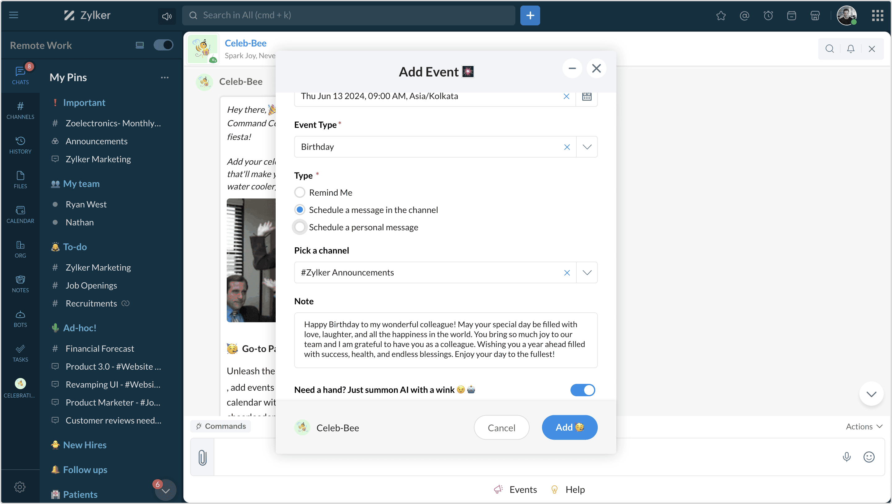 Zoho Cliqでは、どんなメッセージでも「作成 an Event」メッセージ操作を使って簡単にCelebrationイベントへ変換できます。📝