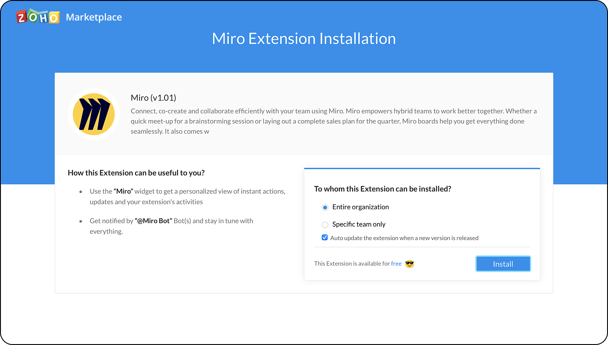 インストール用の リンクにアクセスし、Zoho MarketplaceからMiro拡張機能をCliqにインストールします。