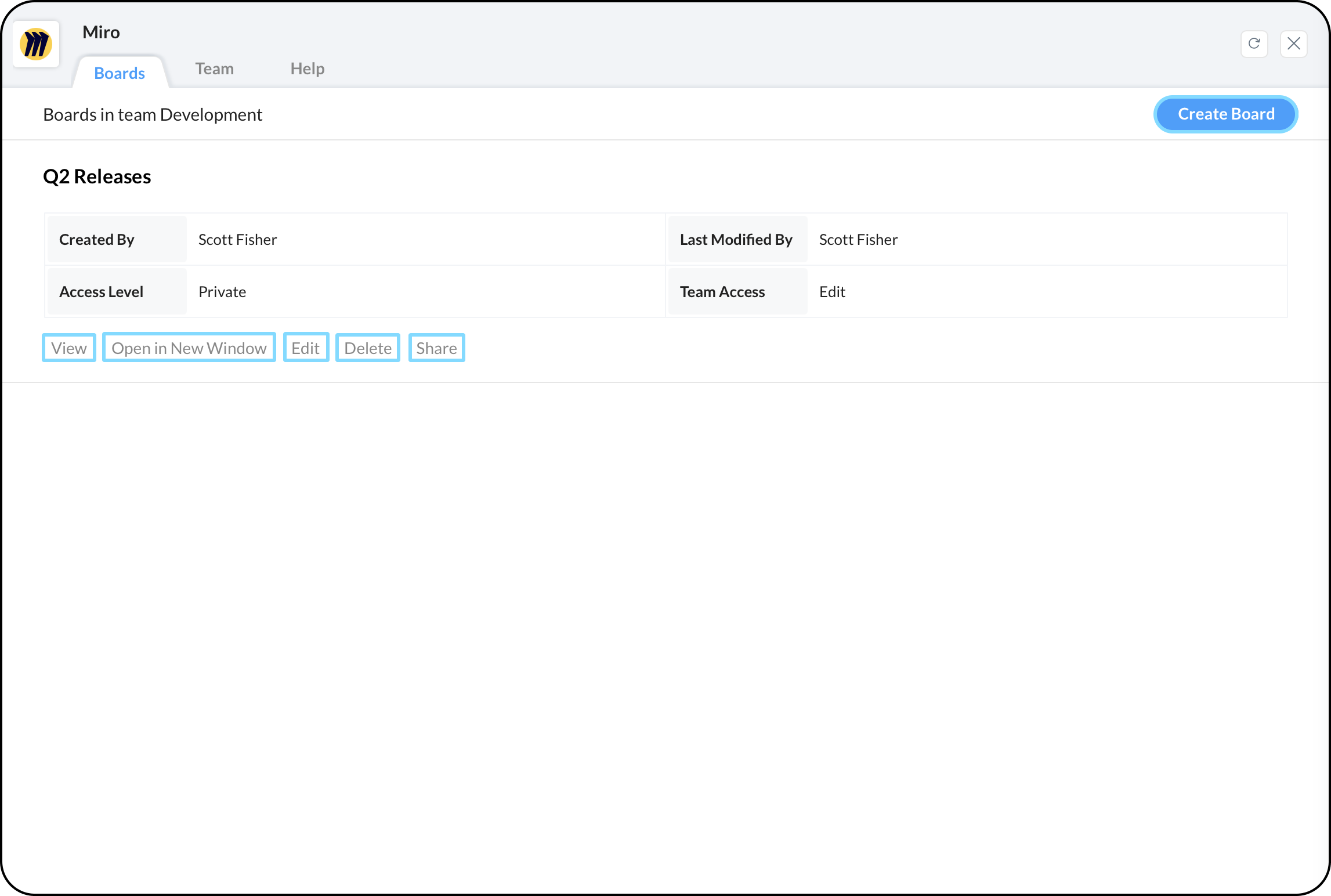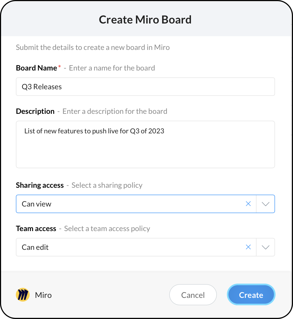 「Boardの作成」ボタンを選択し、ボード名、説明、共有アクセス(表示またはコメント)、チームアクセス(表示、コメント、または編集)を入力し、「作成」をクリックしてください。