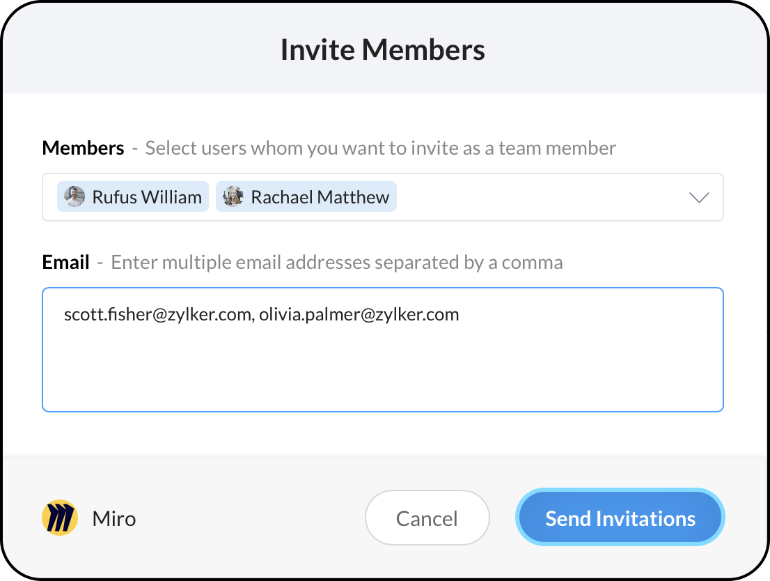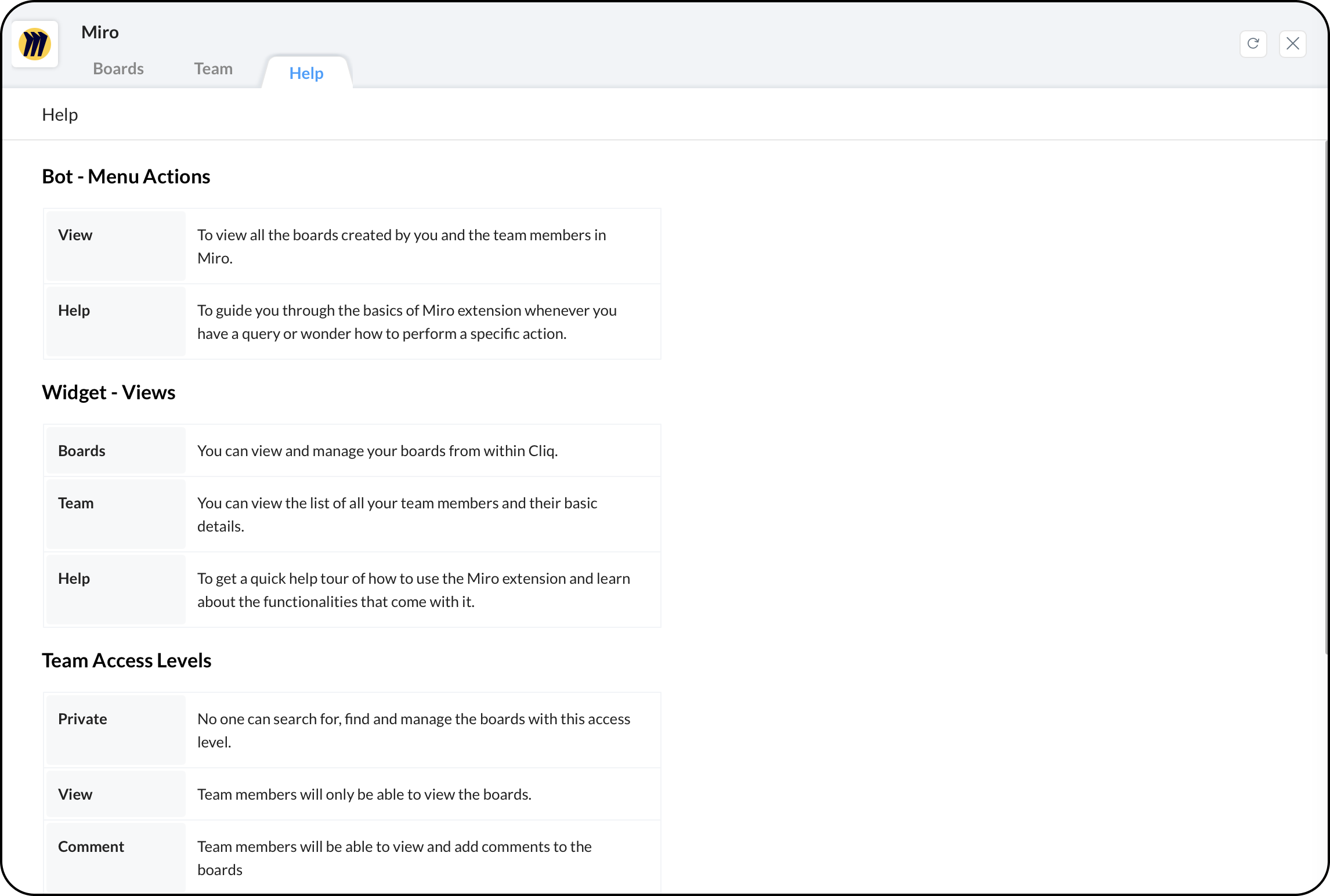 Miro拡張機能をインストール後、アカウントと接続してCliq内のボードやチームにアクセスできます。接続の作成方法は以下の通りです。