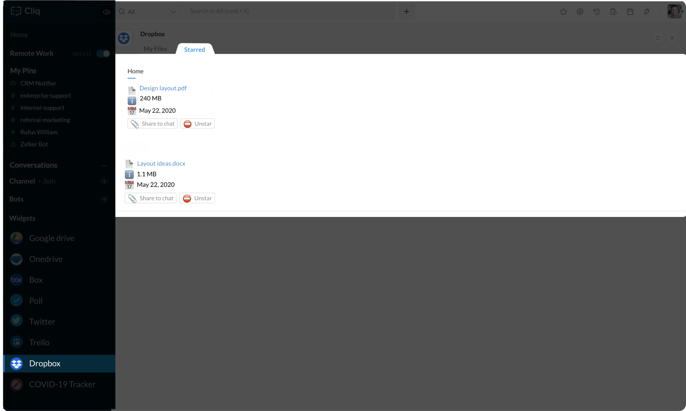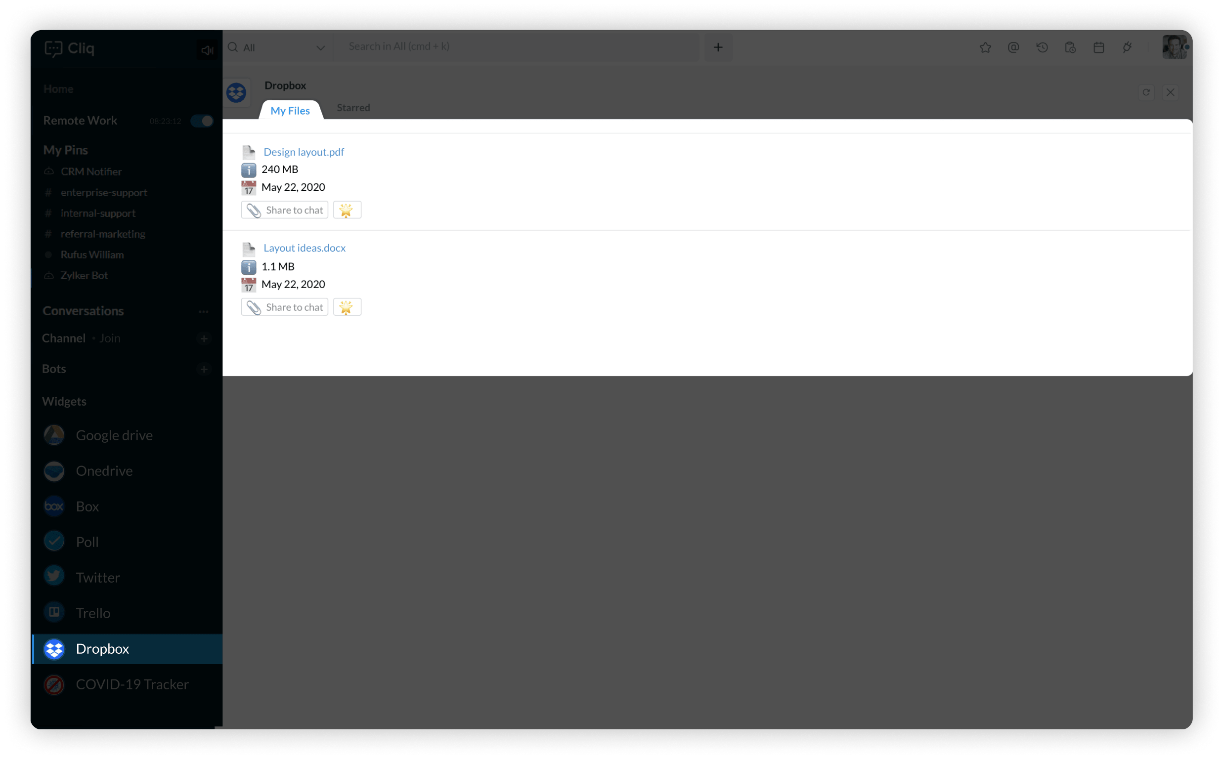 Cliq用のDropbox拡張機能をインストールするには、以下のボタンをクリックしてください。チャットウィンドウからのファイルの共同作業と管理を快適に体験してください。