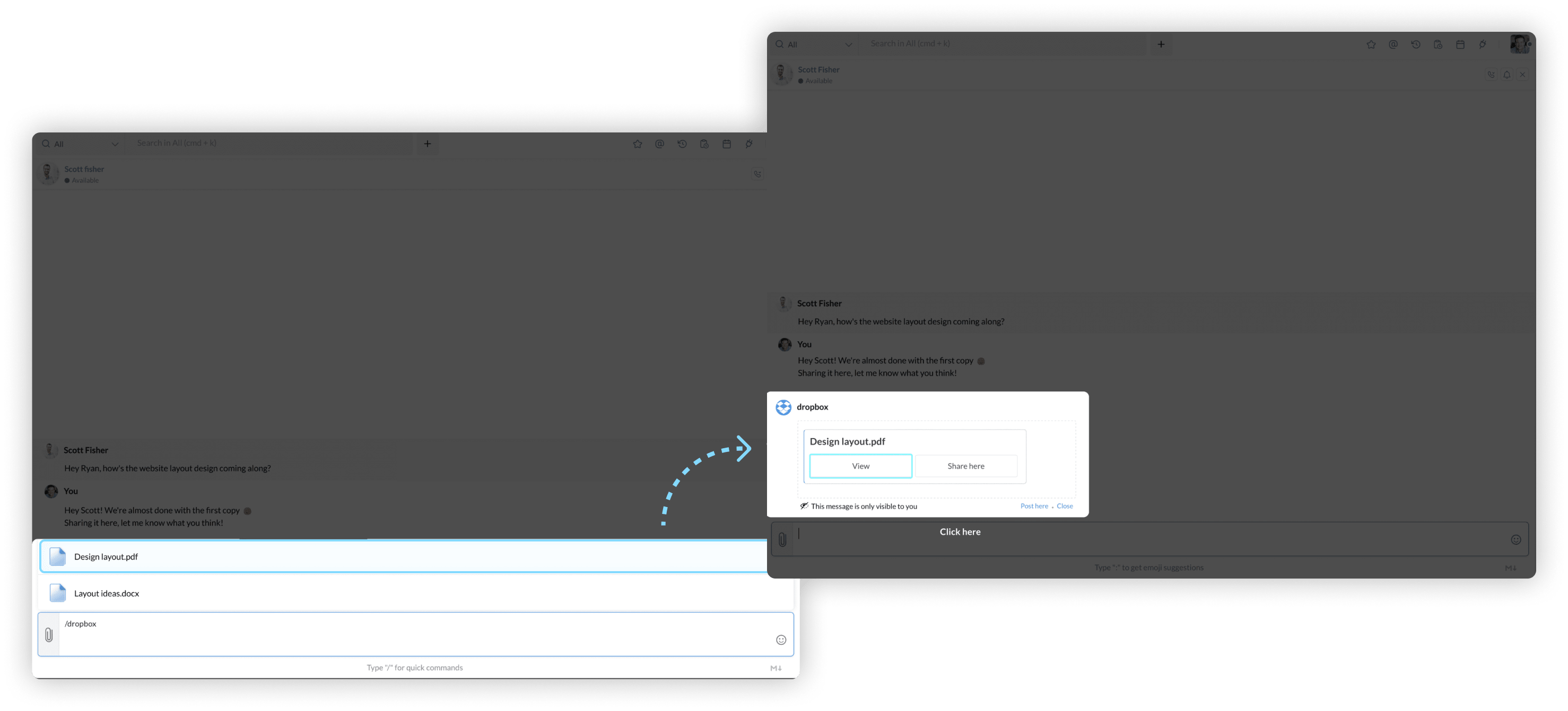 チャットで共有されたファイルやドキュメントを、Dropboxフォルダーにアップロードすることで、簡単にアクションを起こすことができます。以下の手順に従ってください: