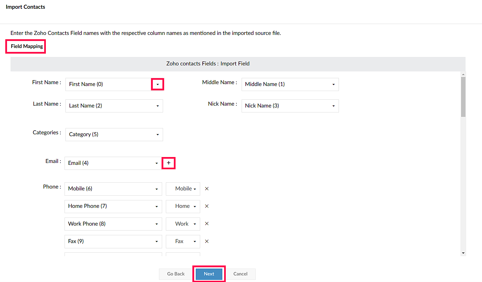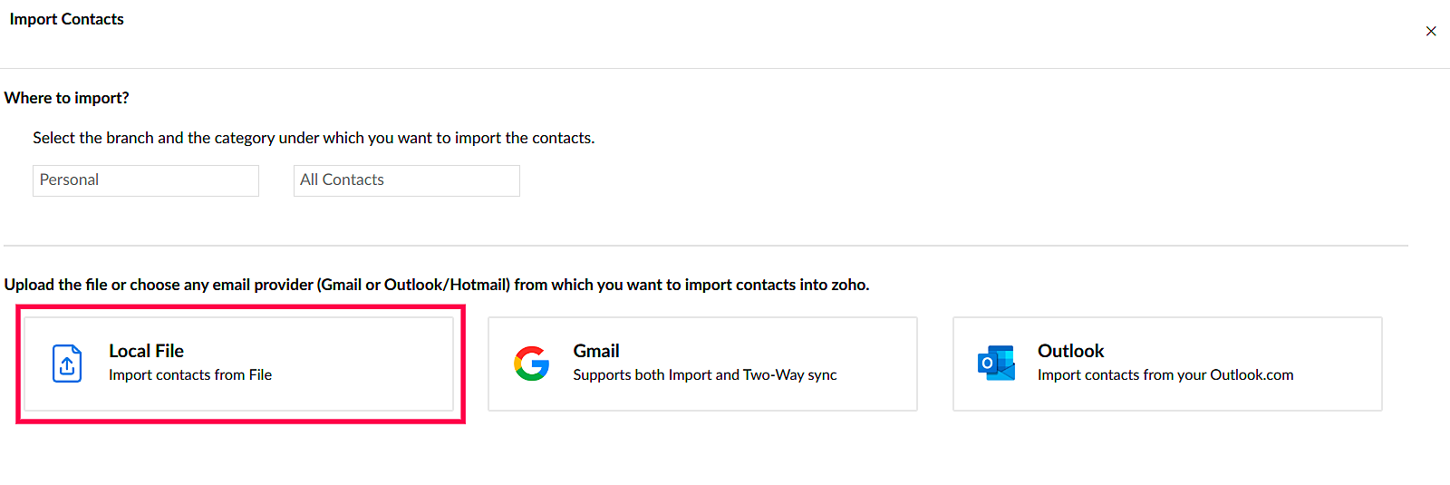 あなたのローカルのデスクトップファイルからも連絡先をインポートできます。Zoho ContactsはCSV、LDIF、VCFファイル形式をサポートしています。