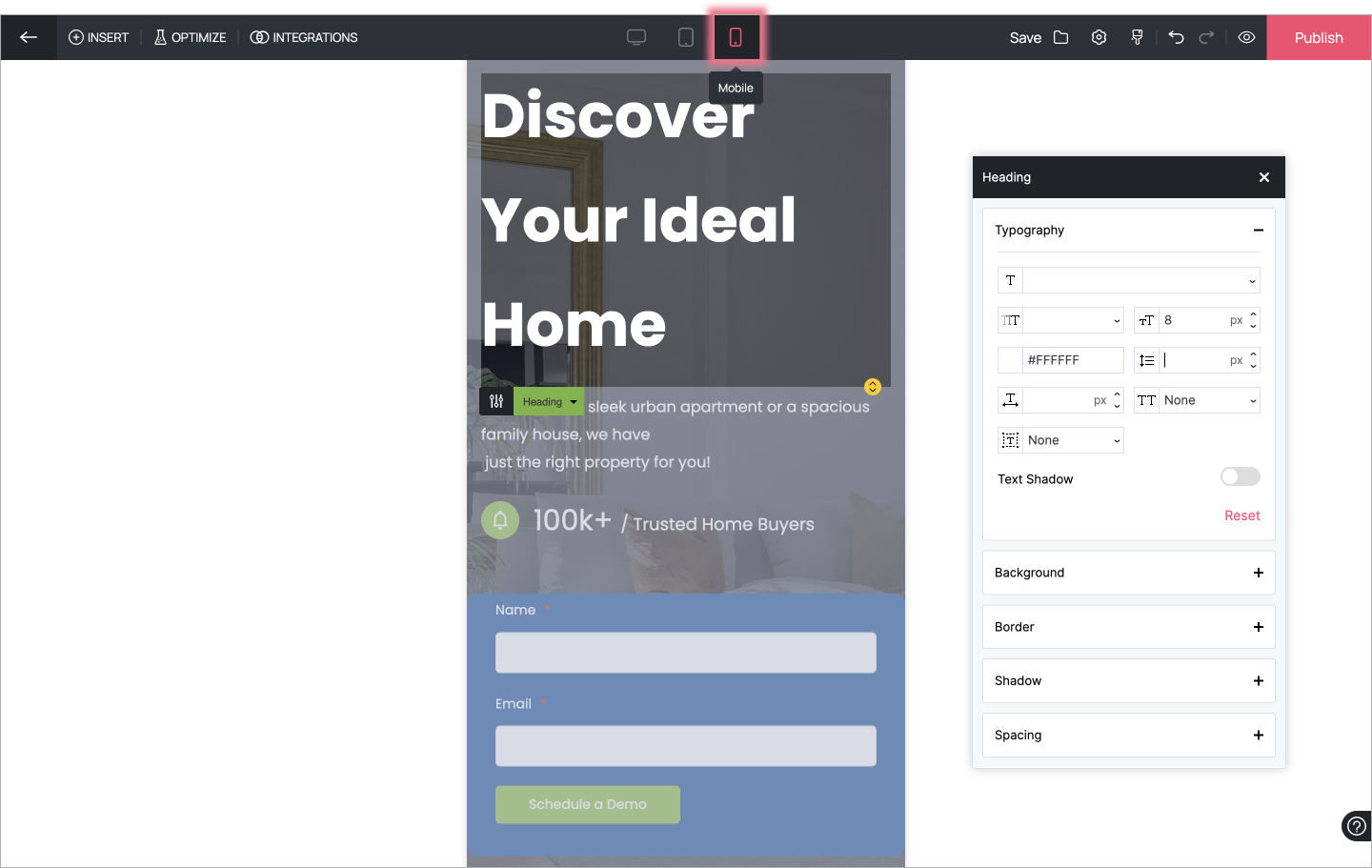 1. モバイルまたはタブレット アイコンをクリックして、ランディングページをそれらのスクリーンサイズに適合させます。