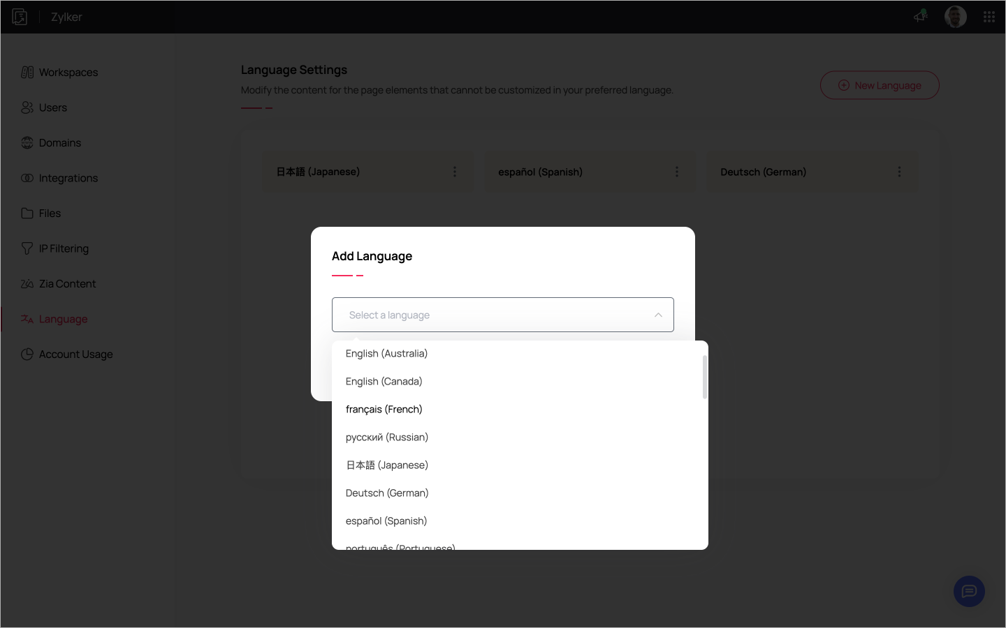3. 対応している言語リストから、ランディングページで使用する任意の言語を追加できます。
