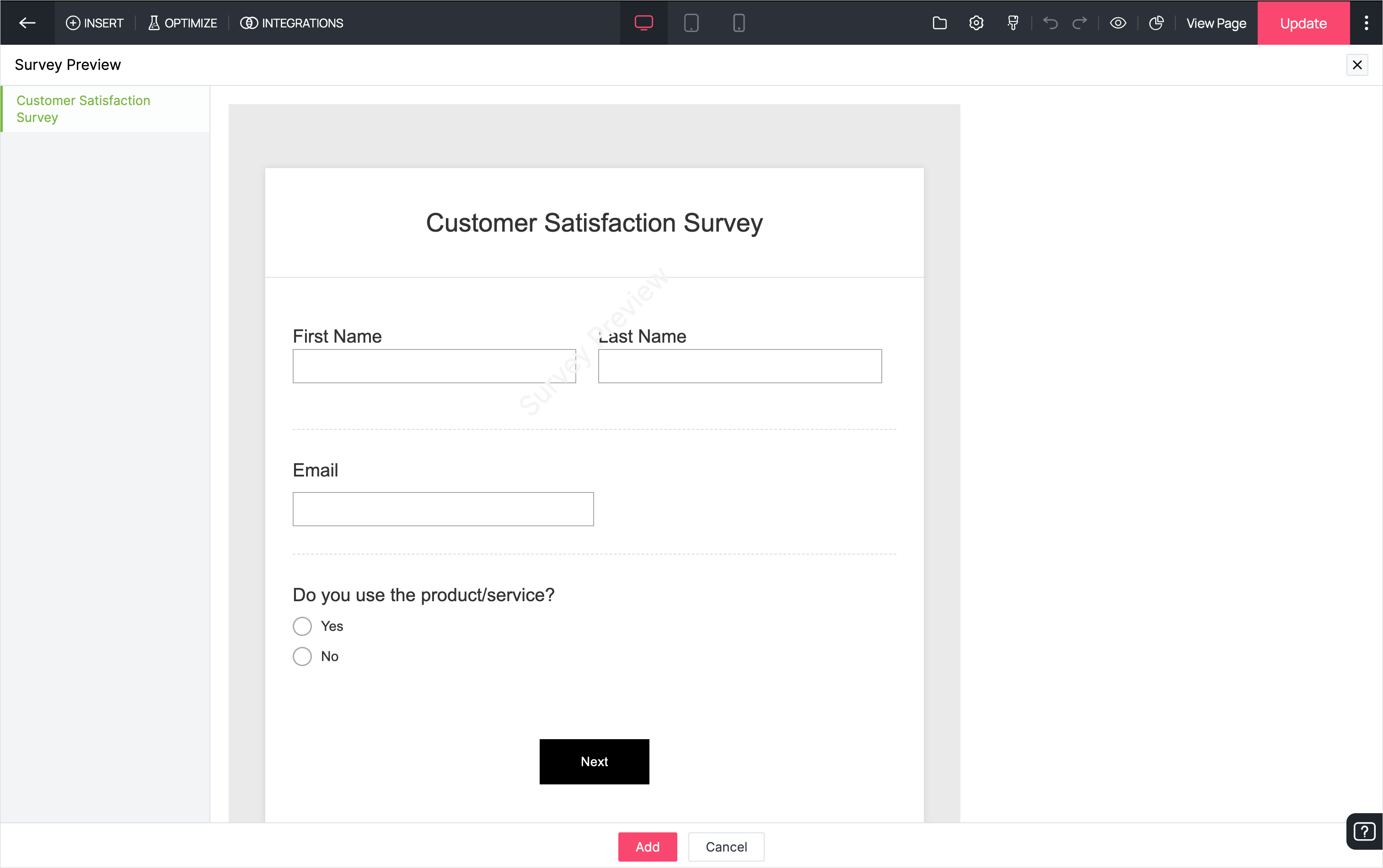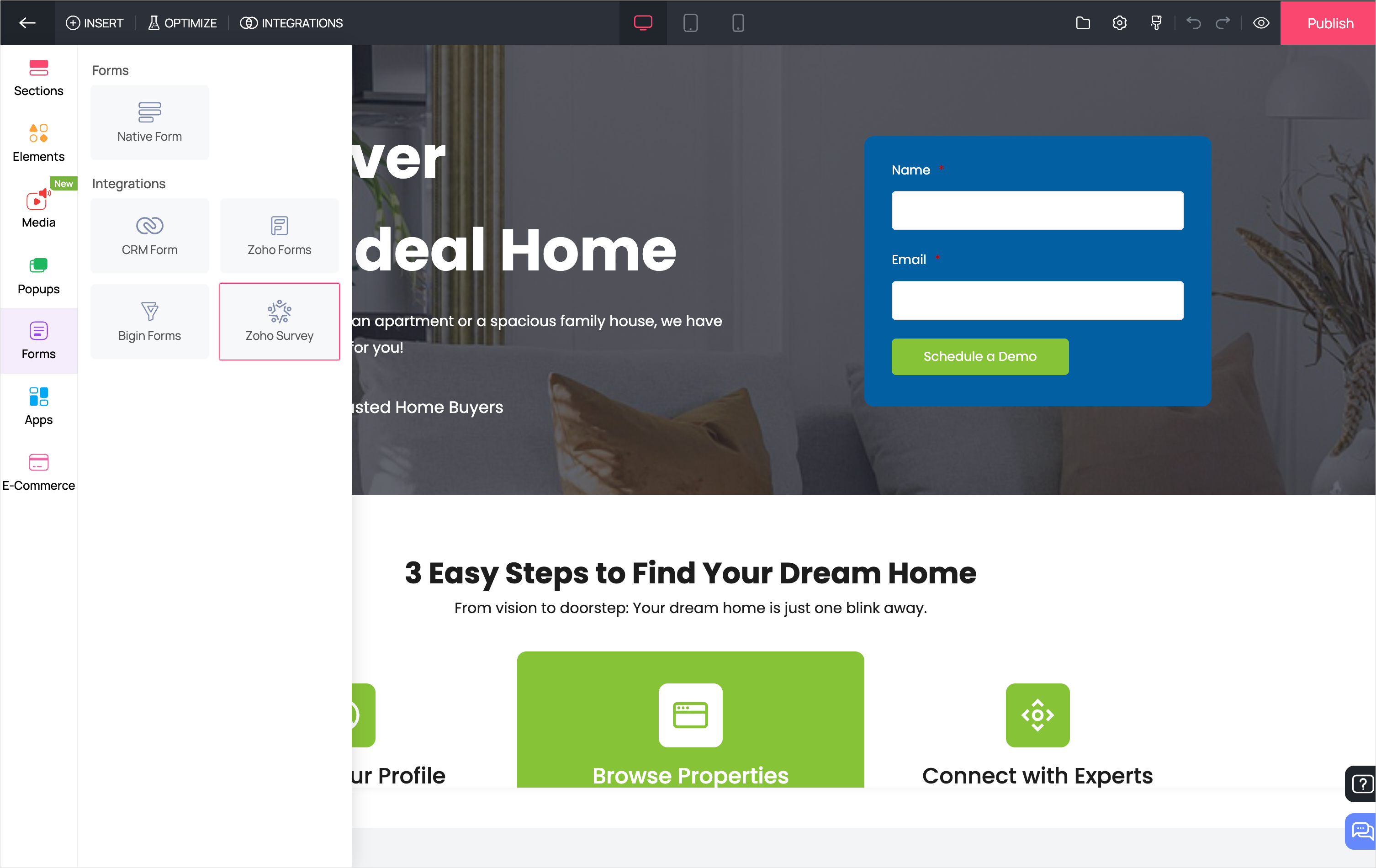 このオプションを選択すると、Zoho LandingPageポータルで作成したページの一覧が表示されます。ページを選択し、設定を保存できます。