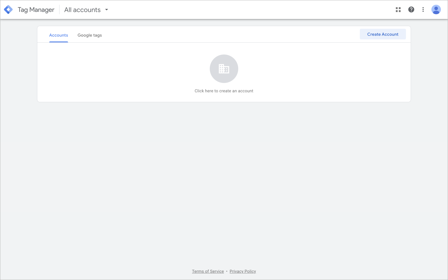 1. Google Tag Managerアカウントで、アカウントを作成をクリックして新しいコンテナを作成します。