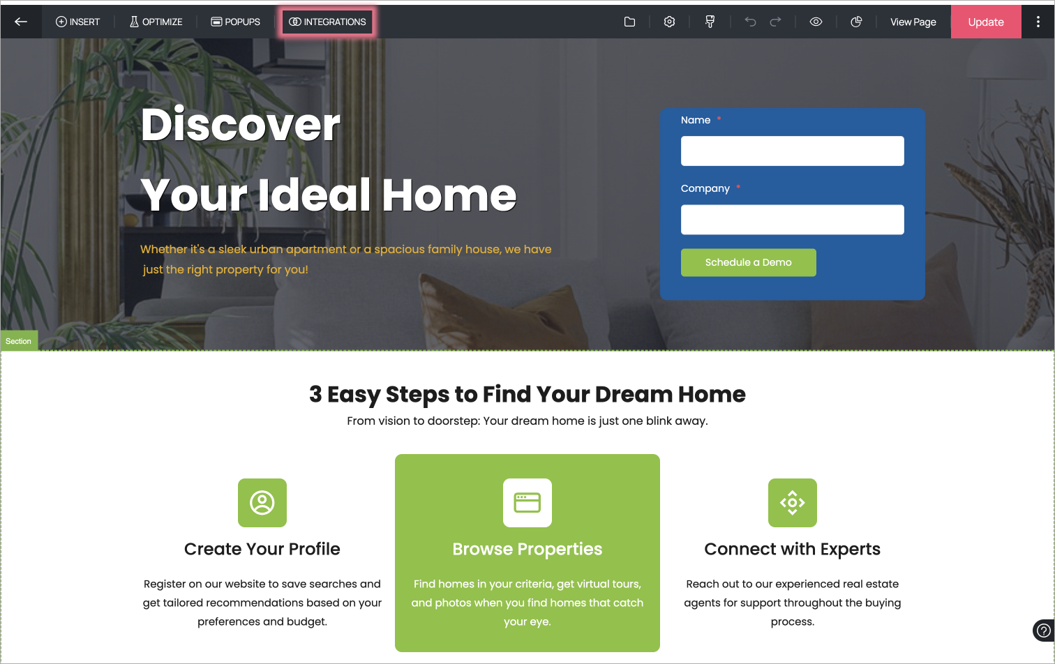 1. ランディングページビルダーで、上部の棒グラフにある「Integrations」をクリックして、ランディングページの連携機能を表示・管理します。