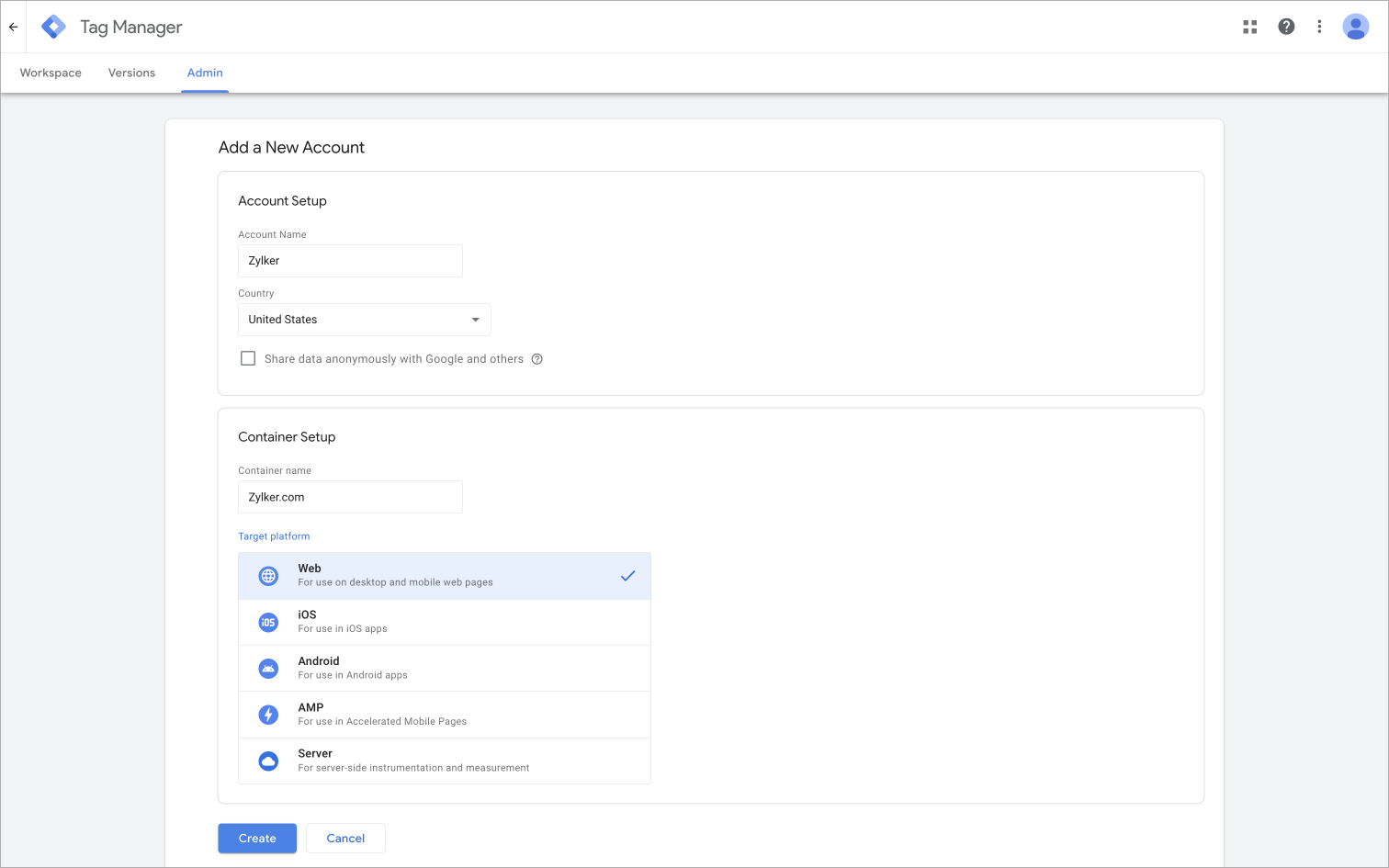 2. アカウント名、国、コンテナ名、対象プラットフォームを追加します。作成をクリックしてコンテナを作成します。