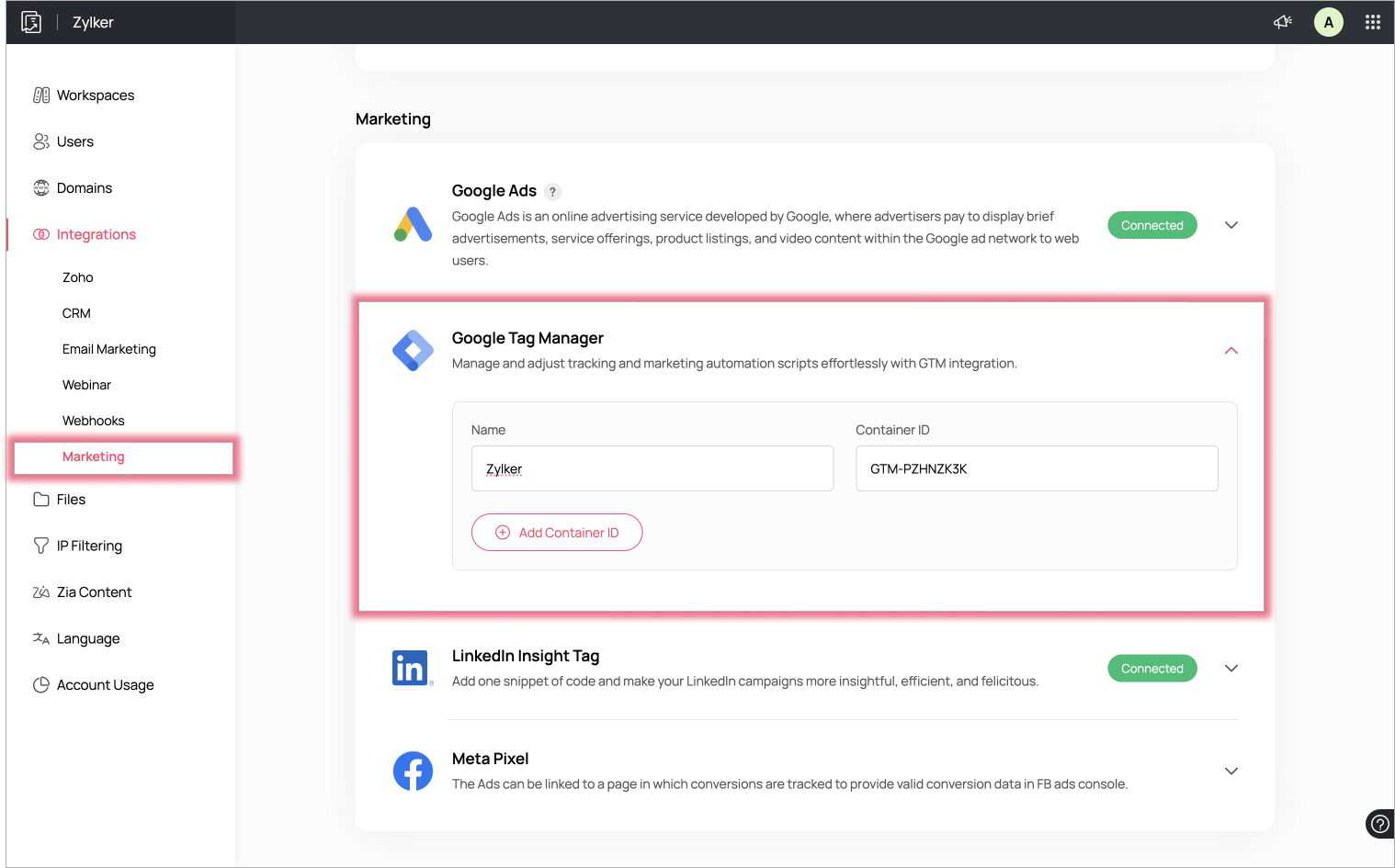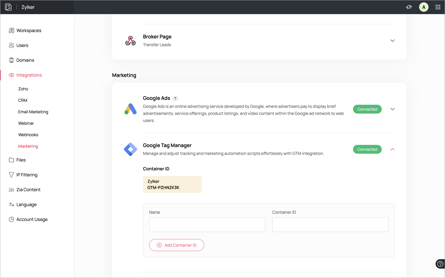 2. Integrationsタブを選択し、表示されるサブメニューからMarketingを選びます。表示される連携リストでGoogle Tag Managerを選択し、名前とコンテナIDを入力して、Google Tag ManagerアカウントとZoho LandingPageポータルを連携してください。