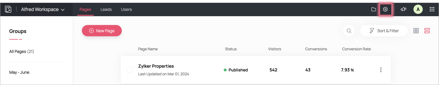 1. LandingPageワークスペースで、右上の設定アイコンをクリックして設定メニューを開きます。