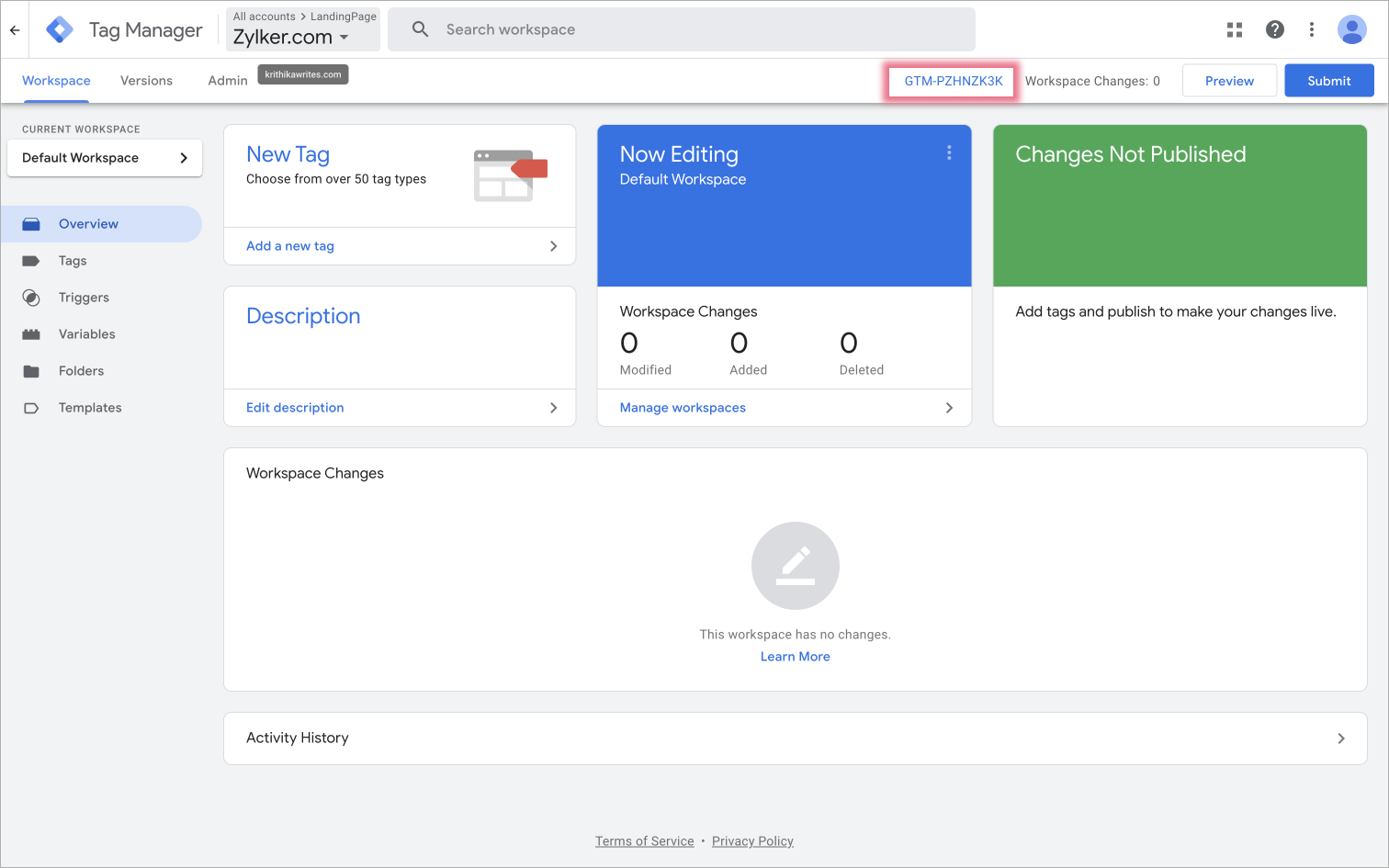 3. コンテナのダッシュボードで、タグ、変数、トリガーを作成できます。コンテナIDをコピーし、Google Tag ManagerとZoho LandingPageアカウントを連携してください。