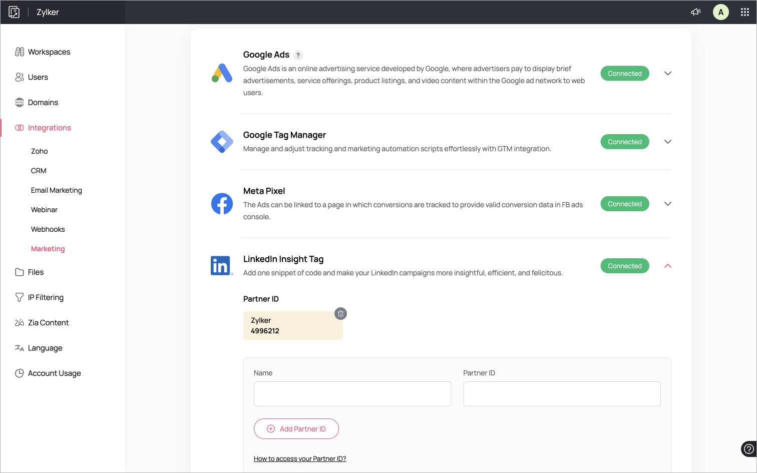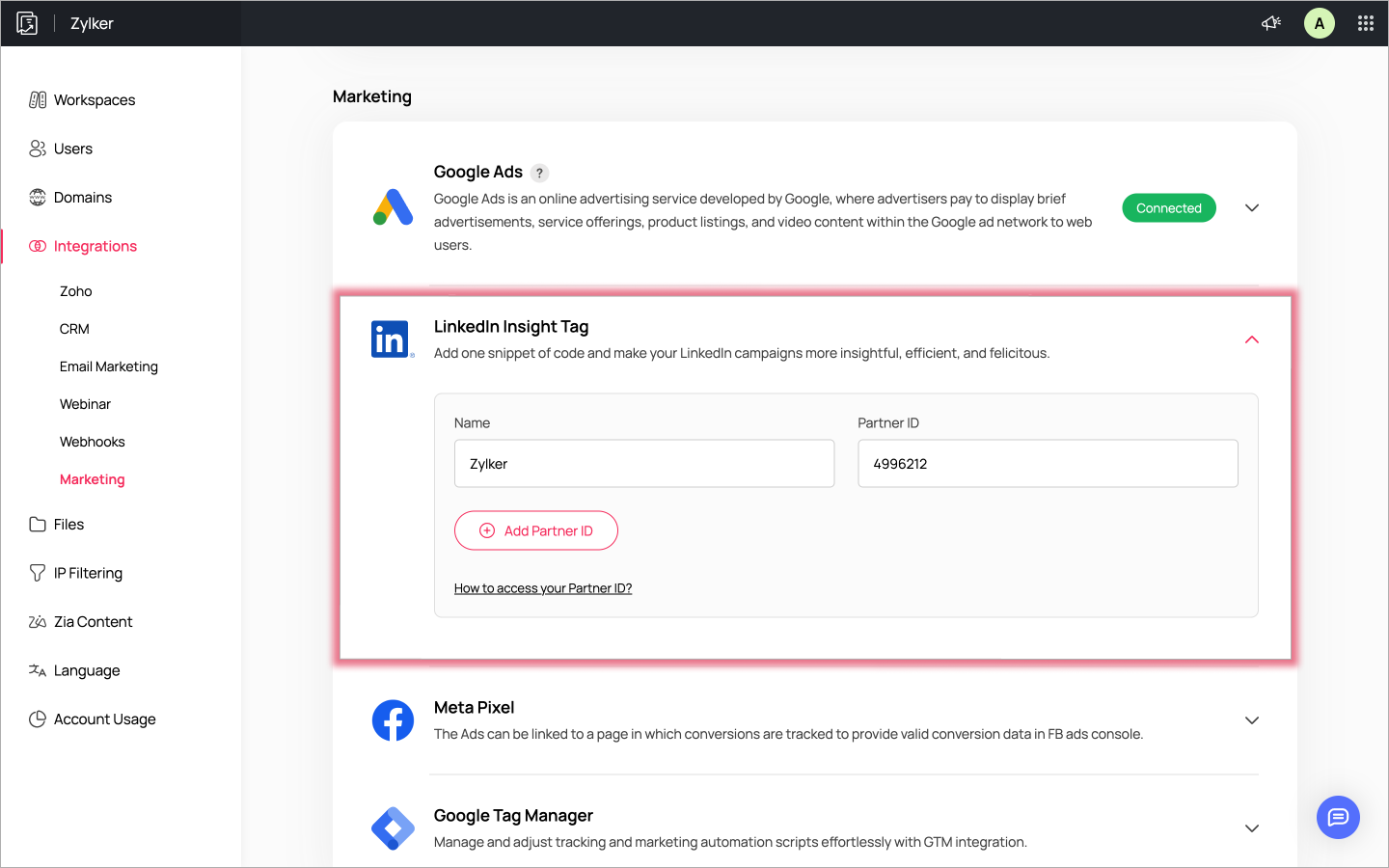 LinkedIn Insight タグを使用すると、LinkedIn広告のコンバージョン追跡やリンク先から離脱した訪問者の再ターゲティング、観客のインサイトコレクションが可能になります。それはZoho LandingPageにおいて、あなたのパートナーIDを直接使用してLinkedIn Insight タグを連携可能にします。