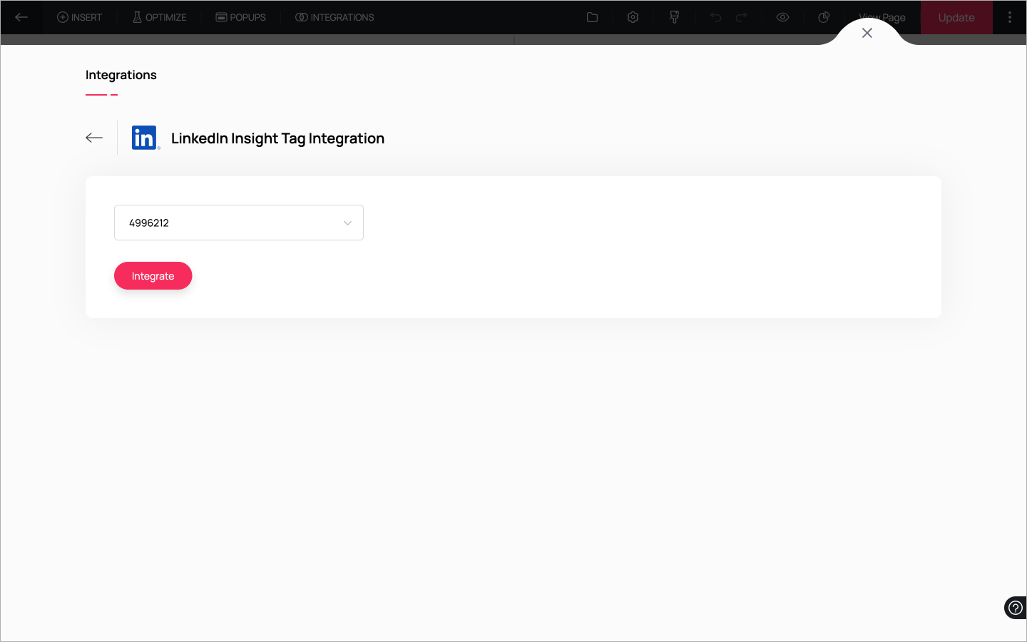1. ランディングページビルダーで、トップの棒グラフでIntegrationsをクリックし、ランディングページの統合を表示および管理します。