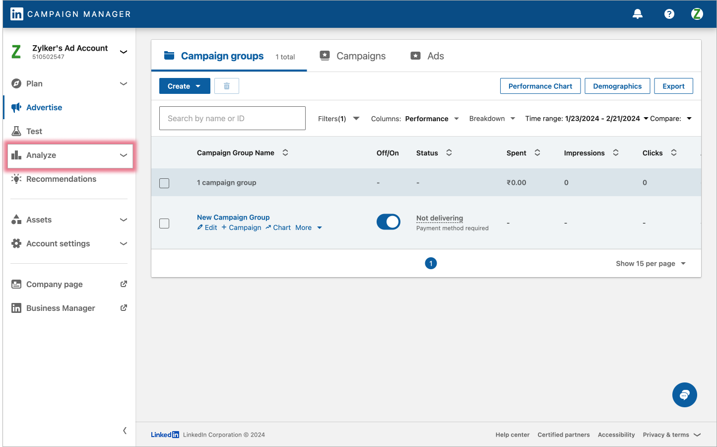 1. LinkedIn Campaign Manager アカウントにサインインします。Campaign Managerは、LinkedIn広告キャンペーンの作成、開始、性能を評価するためのLinkedInのツールです。LinkedIn Campaign Manager アカウントのダッシュボードにて、Insight タグの詳細情報をAnalyze(分析)タブからドロップダウン メニューを使って探します。