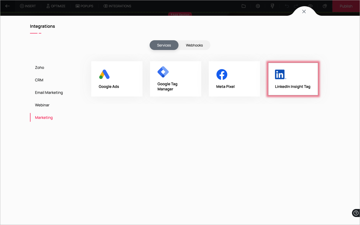 2. 統合ウィンドウで、表示されるカテゴリーからMarketingをクリックし、マーケティング統合のリストからLinkedIn Insight Tagを選択します。