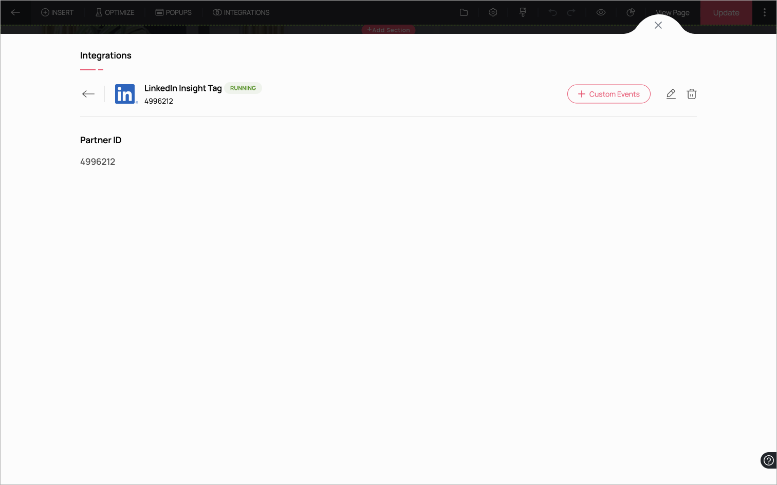 3. スクリーンに表示されているパートナーIDをコピーします。パートナーIDはあなたのアカウントに紐づけられた一意の識別子で、LinkedInとあなたのランディングページ間でコンバージョン追跡と広告キャンペーンの最適化を可能にします。このパートナーIDを使って、あなたのLandingPageアカウントと連携します。