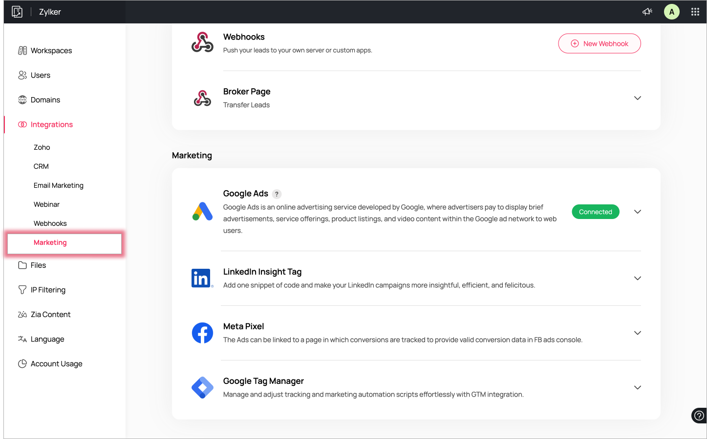 Zoho LandingPageアカウントの連携設定は、ポータルの所有者と管理者のみが可能です。レンディングページのポータル/workspaceにおけるポータルの所有者、管理者、そしてワークスペースマネージャーは、それらのページの連携可能なインテグレーションを接続、一時停止、そして解除することが可能です。