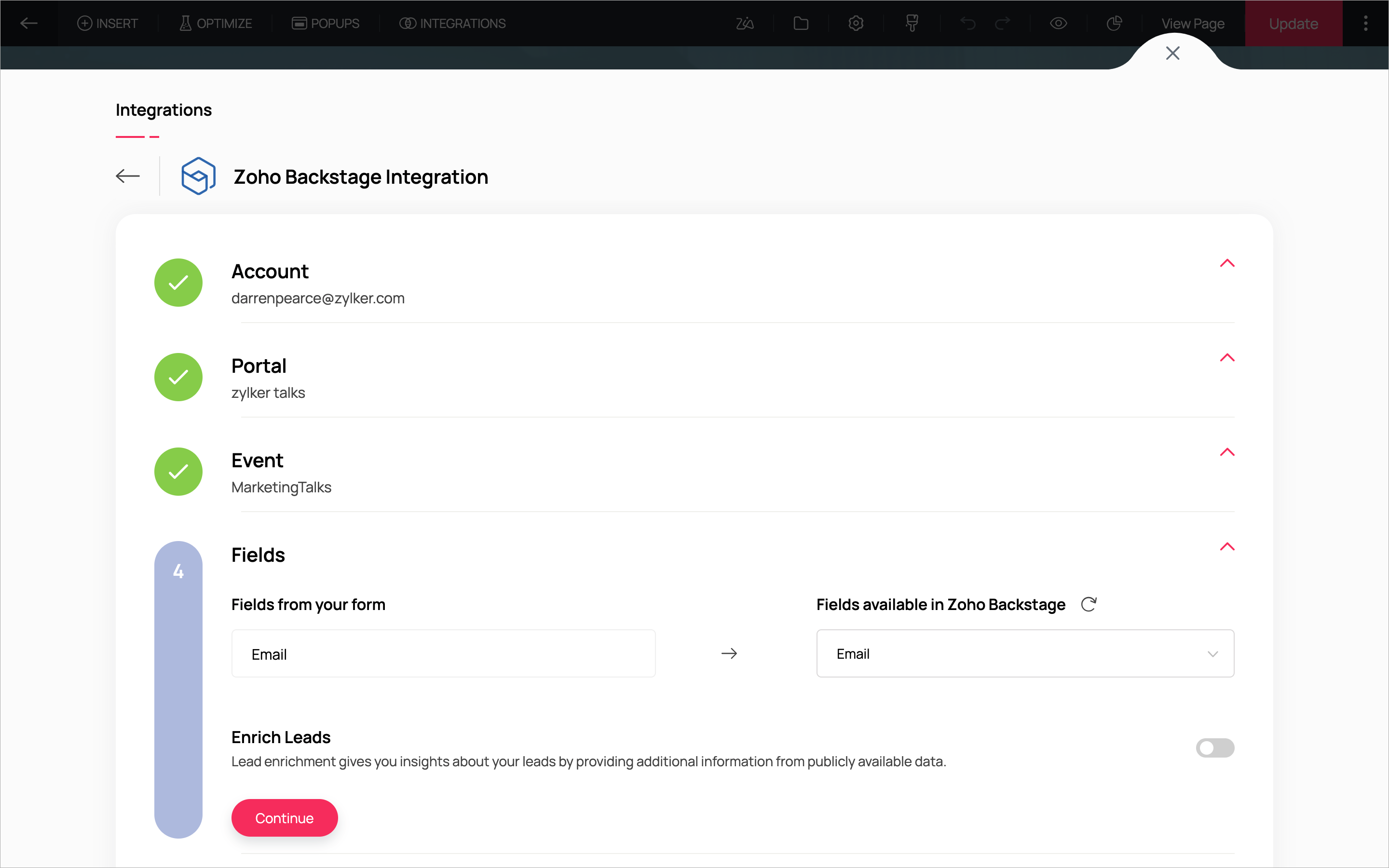 3. ランディングページフォームの項目を、Zoho Backstage内の該当項目にマッピングします。Enrich 見込み客を有効にすると、潜在的な見込み客についてさらに詳しく把握できます。
