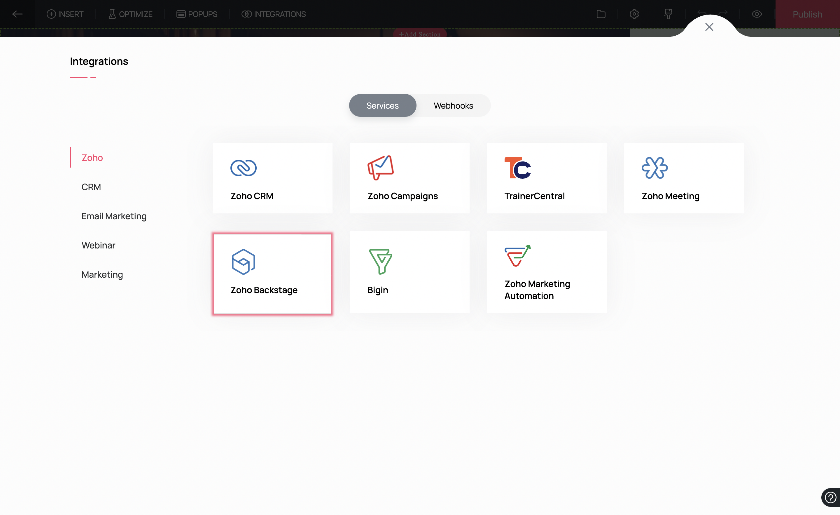 2. Integrations」をクリックし、表示されたサブメニューからZohoを選択します。表示されたインテグレーション一覧から Zoho Backstageをクリックします。